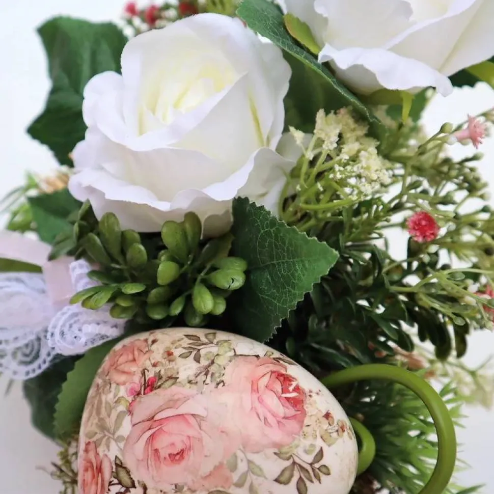 Es wurde eine ovale Keramikschale mit Rosenmotiv verwendet, dazu passend mit dem gleichen Motiv eine Kugel und die üppigen weißen Rosen im Inneren runden das Bild ab.