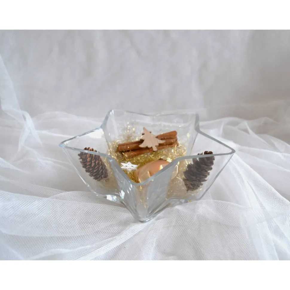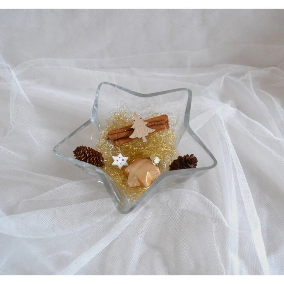 Tischdeko. Glasschale in Sternform mit Weihnachtsdeko in gold