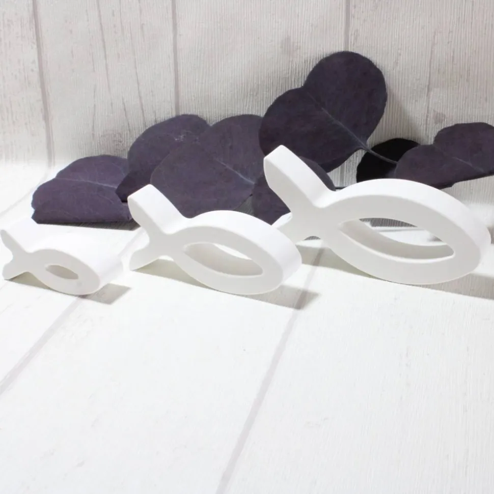 Hier sind von mir handgegossene Fische aus Keraflott oder Raysin. Die Fische eignen sich toll als Tischdeko für alle christlichen Feste z.b. Konfirmation, Kommunion, Firmung, Taufe und Hochzeit. Den großen Fisch kann man super als Serviettenring nutzen.