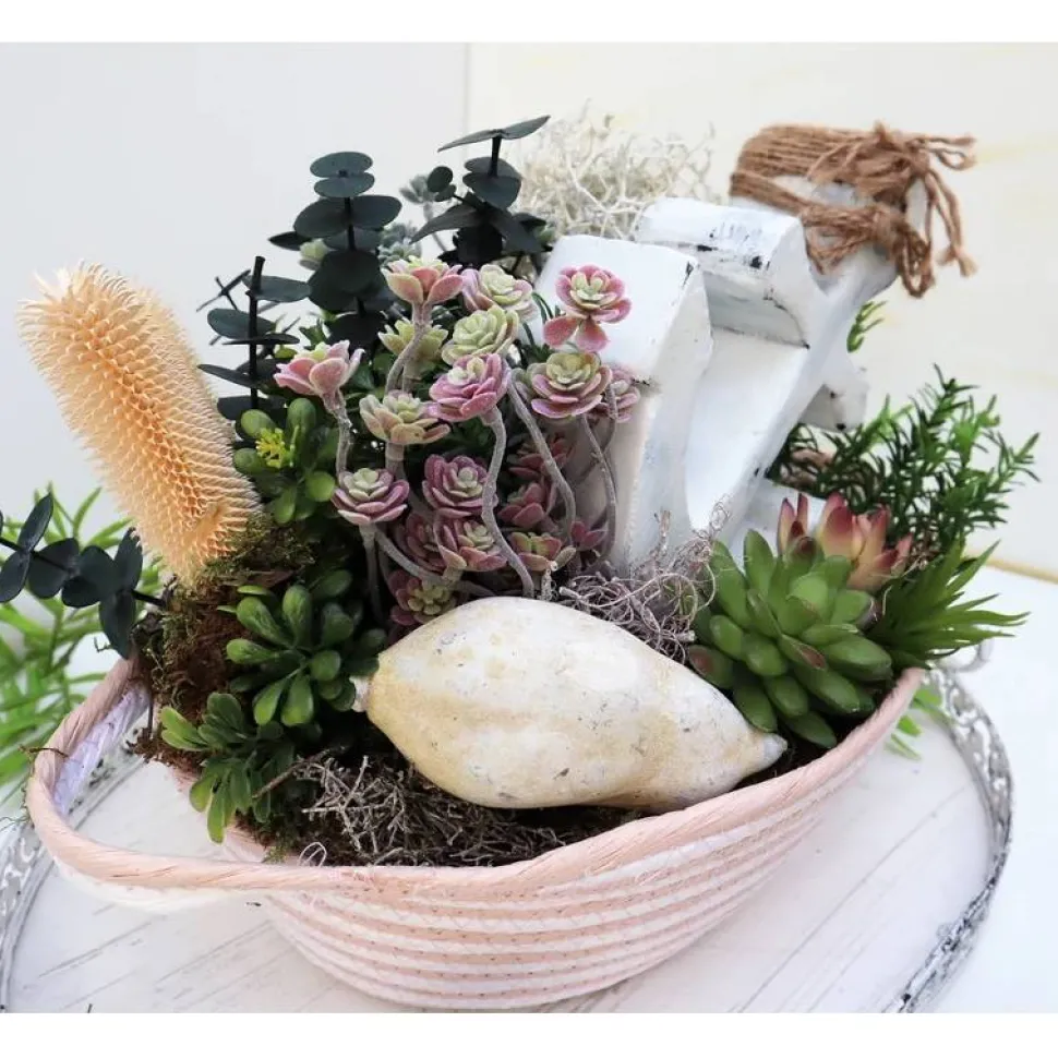 Material: Textilkorb, künstliche Blüten und Grün, Naturmaterialien, Holzanker