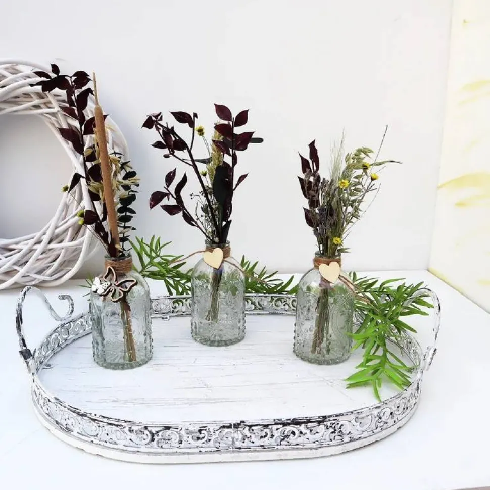 Material: Glasvasen, verschiedene Trockenblumen, Dekoration
