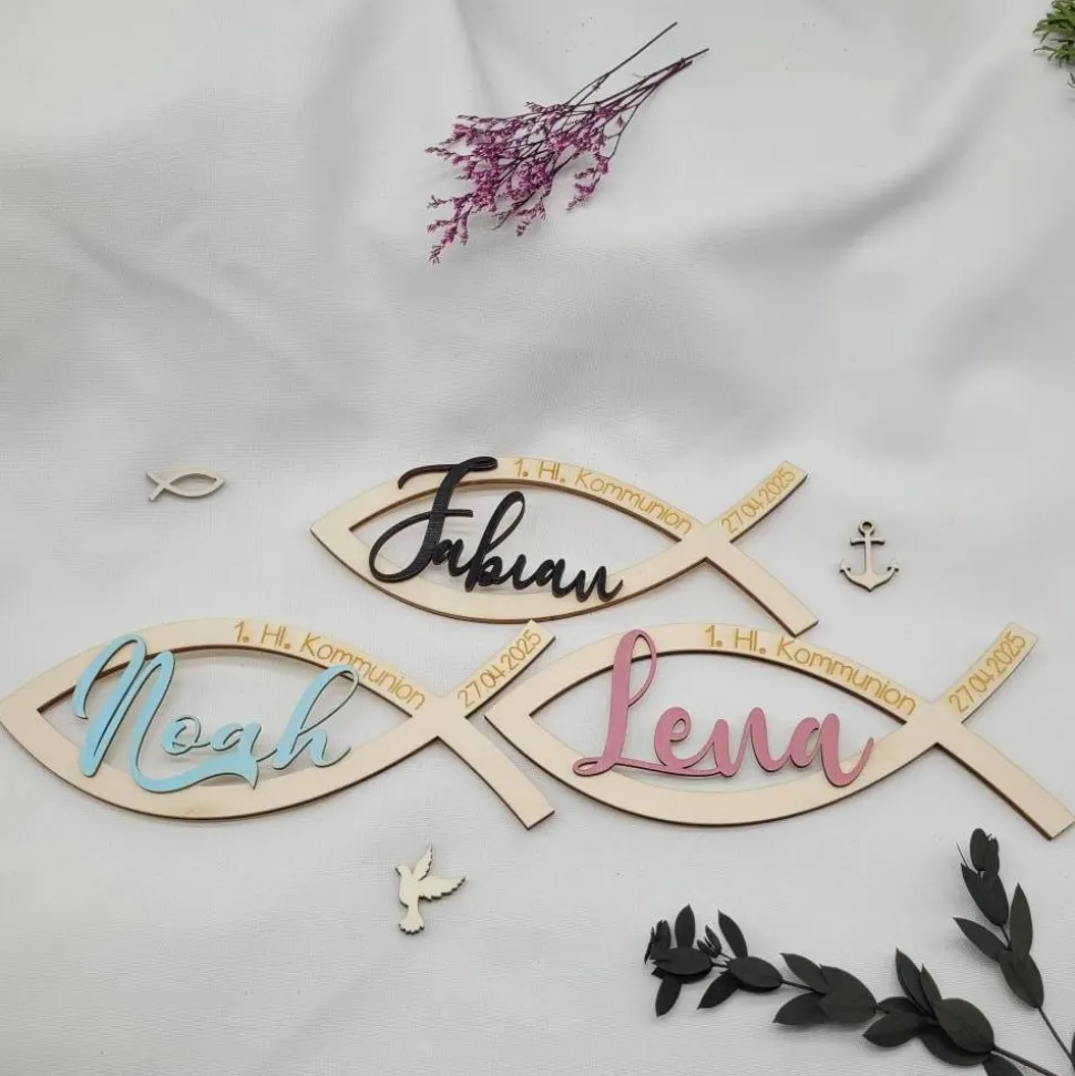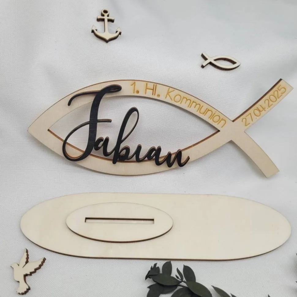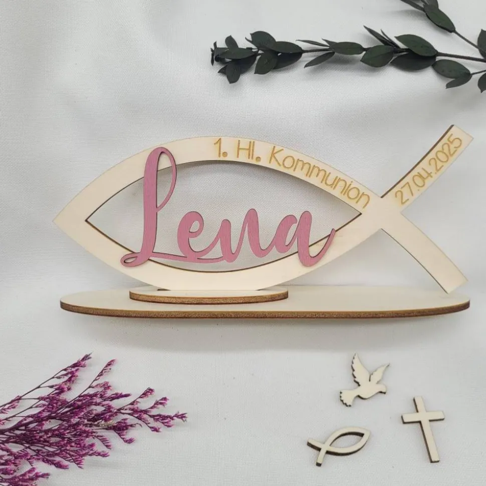 Hergestellt aus Pappelsperrholz wird er mit einem abnehmbaren Ständer geliefert, damit man auch die Möglichkeit hat, den Fisch in andere Dekorationen einzubinden. Personalisiert wird der Fisch mit dem Namen und dem Kommunindatum. Der Name ist farblich wählbar in schwarz, altrosa und hellblau. Verleihen sie ihrer Taufe einen edlen Rahmen und nutzen sie weitere Dekorationen aus unserem Sortiment, um diesen Tag in ein echtes Highlight zu verwandeln.