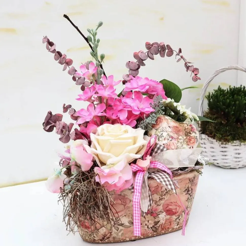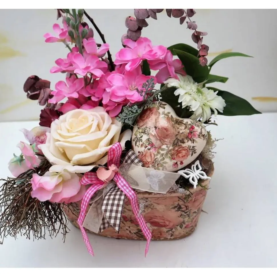 Material: Keramikschale, künstliche Blüten und Grün, Schleifenband, Keramikherz