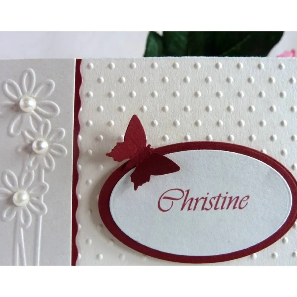 Wunderschöne, aufwändig gearbeitete Tischkarte in cremeweiß/weinrot mit geprägtem Hintergrund und Blumen. Die Tischkarte zieren zusätzlich 3 Halbperlen, ein farblich hinterlegtes Oval auf dem der Name des Gastes aufgedruckt ist und ein Schmetterling.