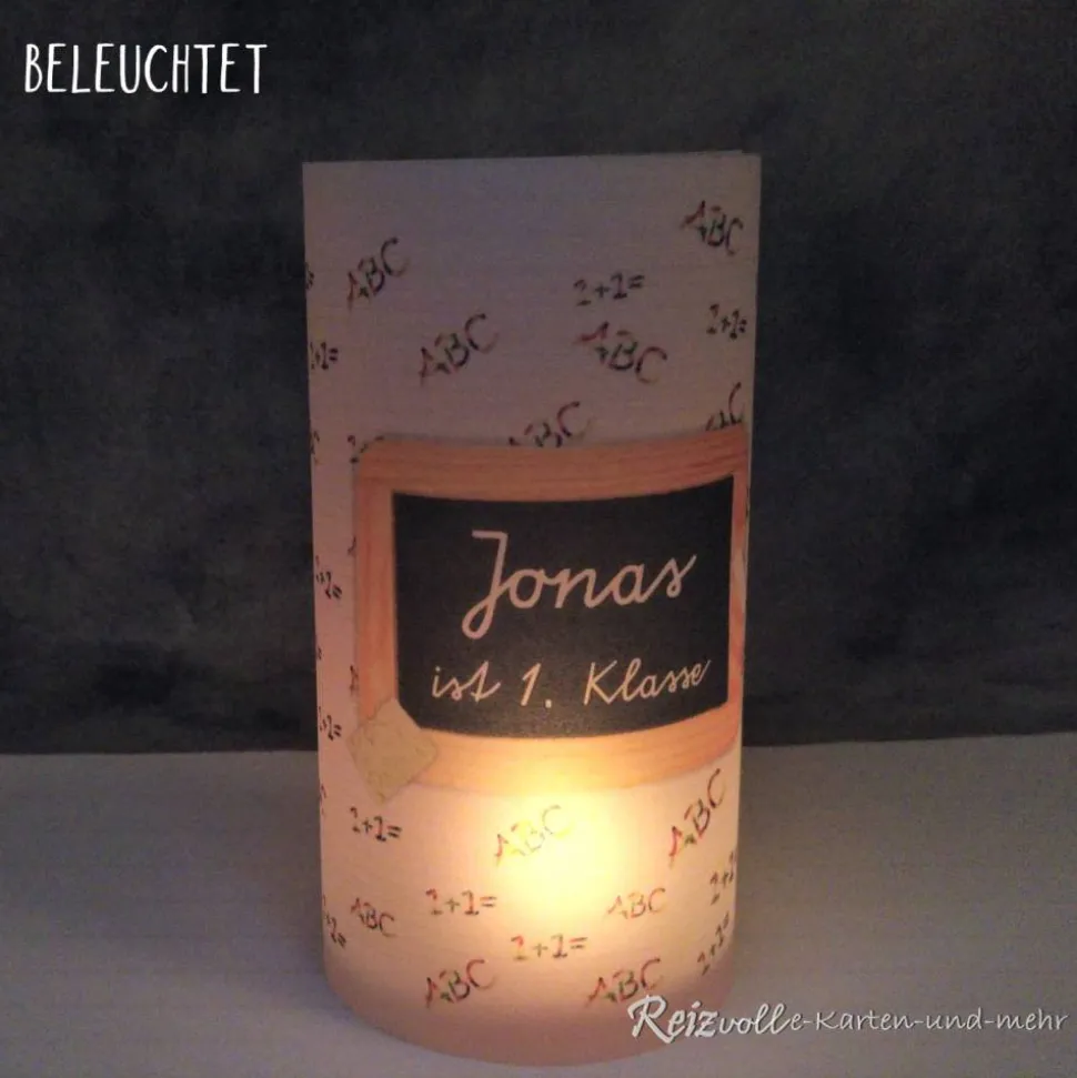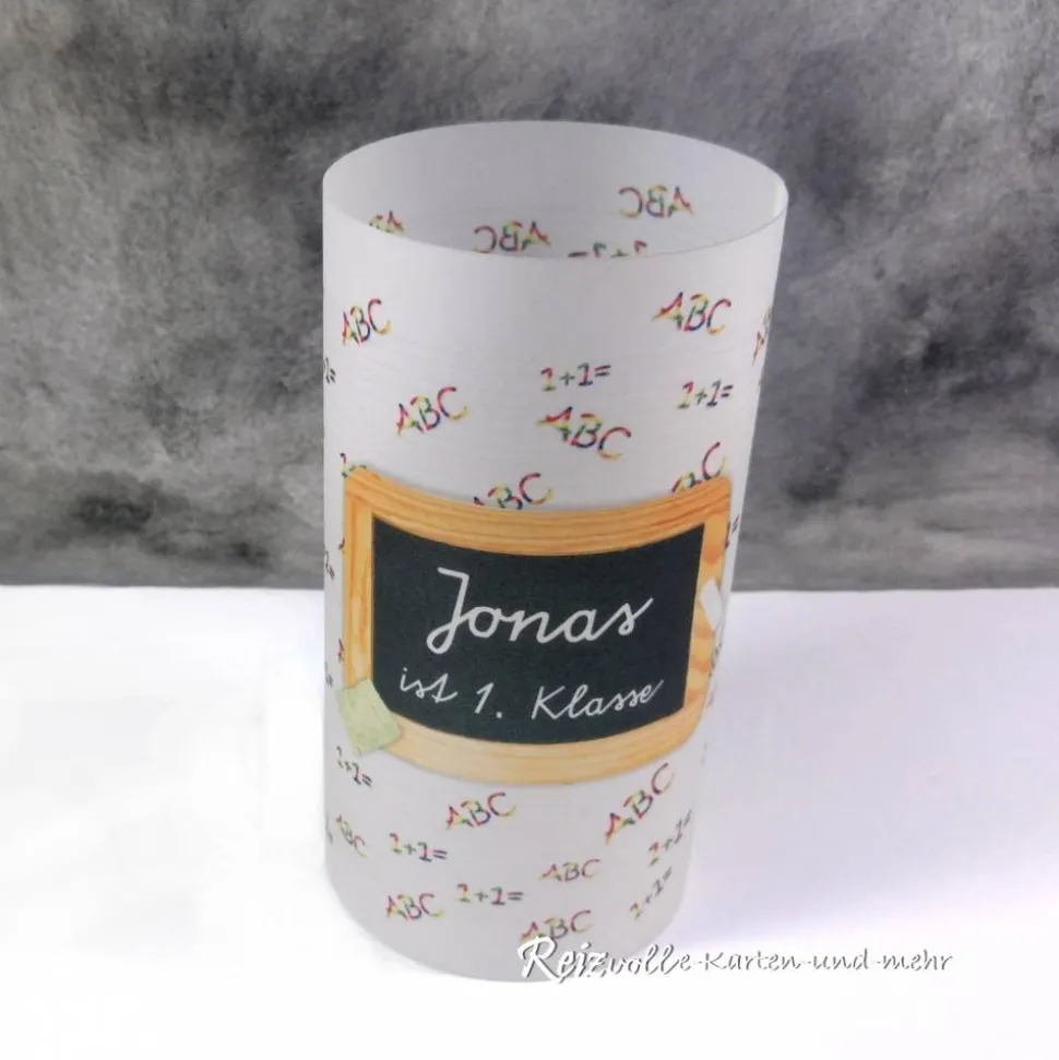 Du erhältst die Lichthülle ungeklebt, bereits mit einem dünnen Doppelklebeband versehen. Das Zusammenkleben gelingt dir ganz einfach selbst. Trage den Namen des Schulkindes ein und mache dieses Deko-Element zu einem liebevollen Highlight.