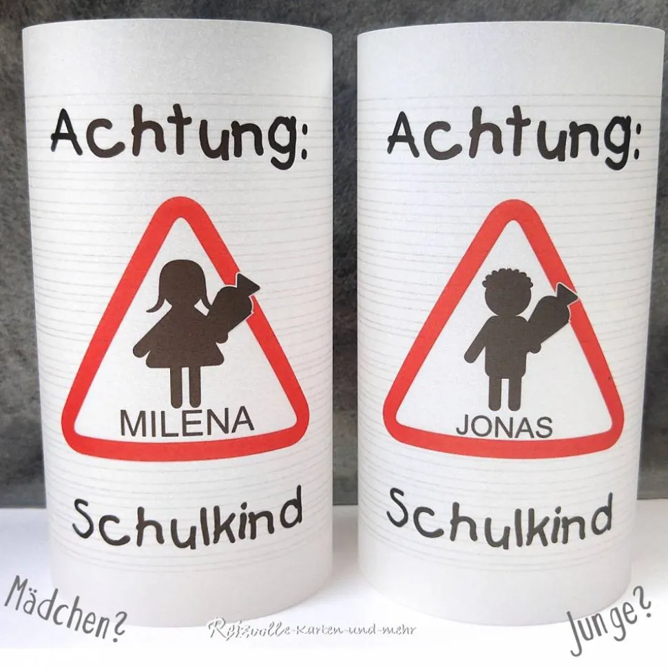 Du erhältst die Lichthülle versehen mit einem dünnen Doppelklebeband, ungeklebt und ohne Glas sowie Leuchtmittel. So kannst du sie ganz einfach selbst zusammenkleben und individuell gestalten. Trage oben einfach den Namen des Schulkindes ein und mache das Tischlicht zu einem einmaligen Highlight.