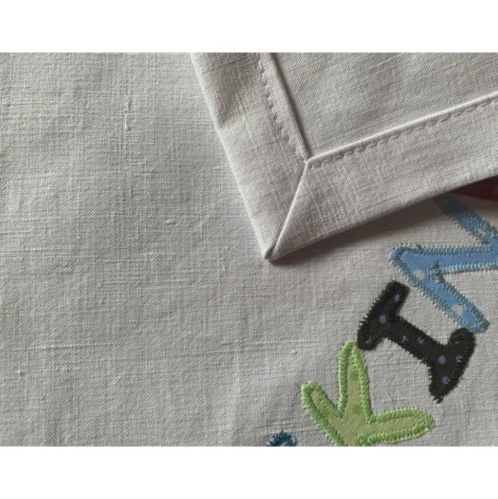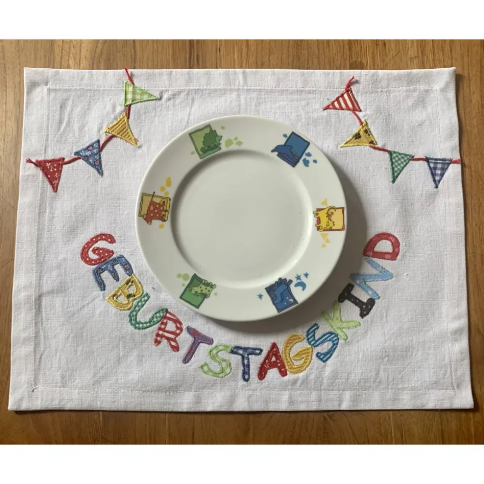 Fröhlich-buntes und auf Wunsch auch personalsierbares Tischset aus Baumwolle für das Geburtskind.