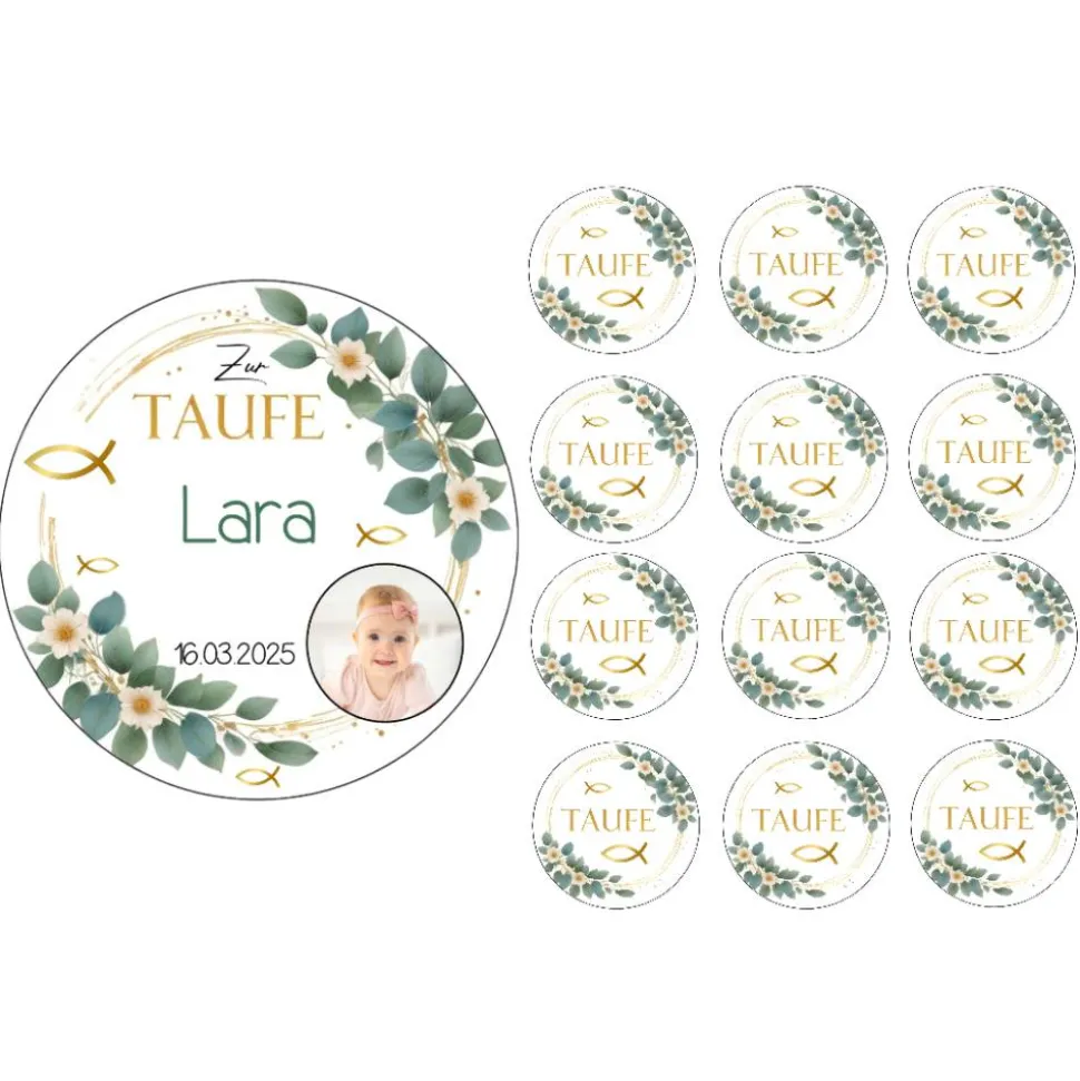 Machen Sie die Taufe zu einem besonderen Anlass mit dem edlen Tortenaufleger Set, bestehend aus einem Tortenaufleger und 12 Muffinauflegern. Personalisiert mit einem Foto, dem Namen und dem Datum der Taufe. Perfekt für einen eleganten Auftritt und ein unvergessliches Erlebnis. Verleihen Sie Ihrer Taufe etwas Einzigartiges!