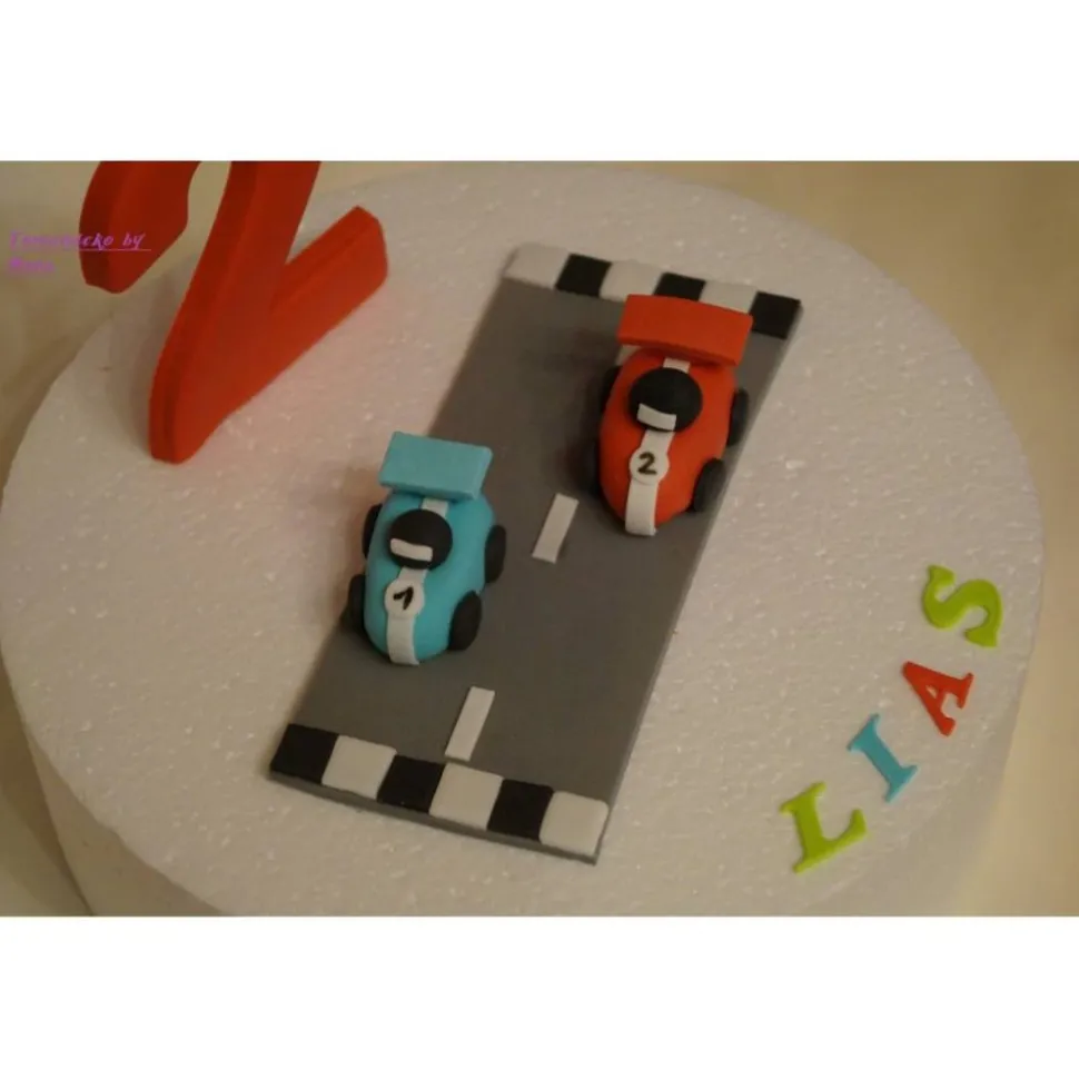 Tortenmotiv Strasse mit 2 Autos entweder 2 Rennautos oder 2 Strassenautos und 3 Autos für den Rand und Zahl und Name .