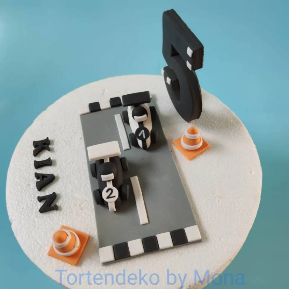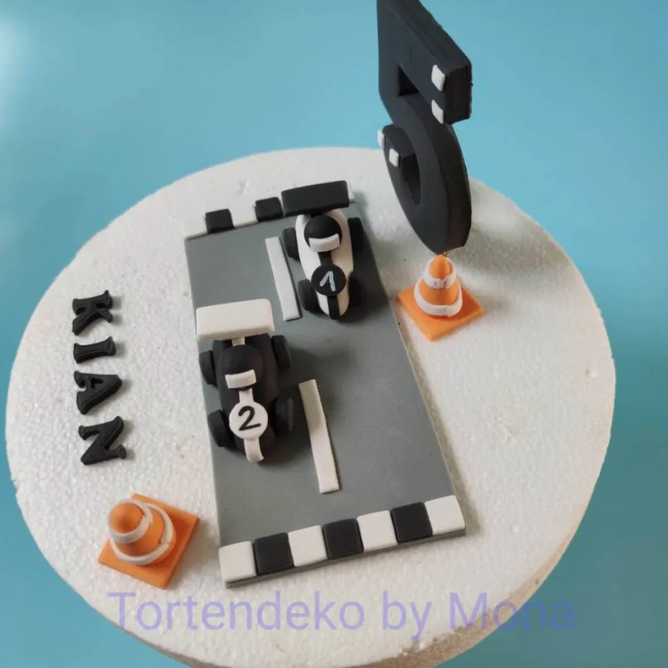 Tortenmotiv Strasse mit 2 Rennautos, 2 Pommern und Zahl und Name .