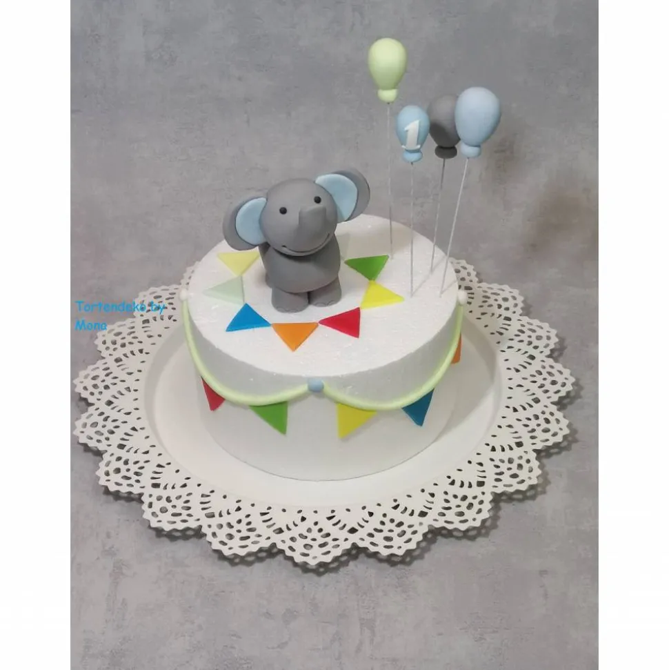 Der Elefant Malu kommt mit 4 Ballons, 30 Dreiecke verschiedene Farben für eine Wimpelkette und er hat eine Höhe von 11 cm .