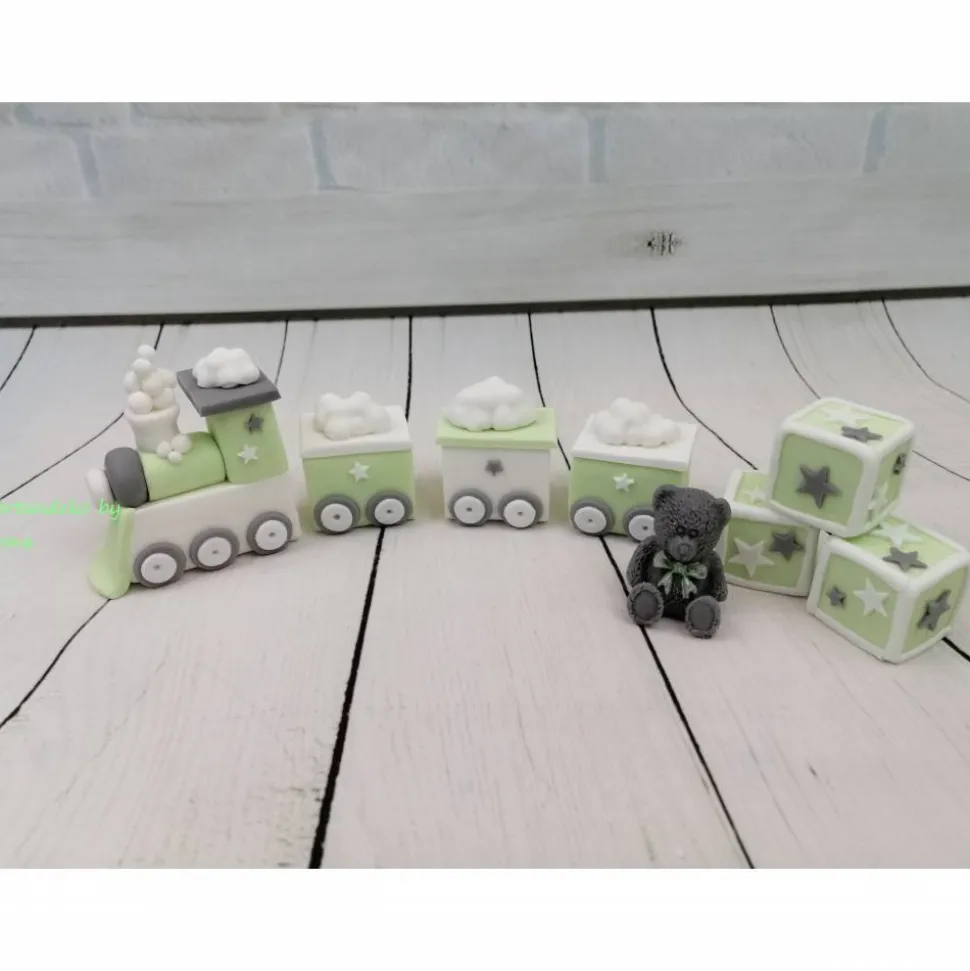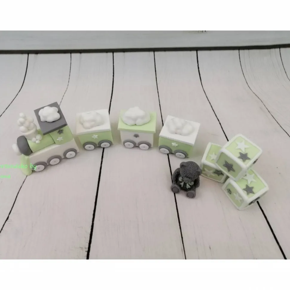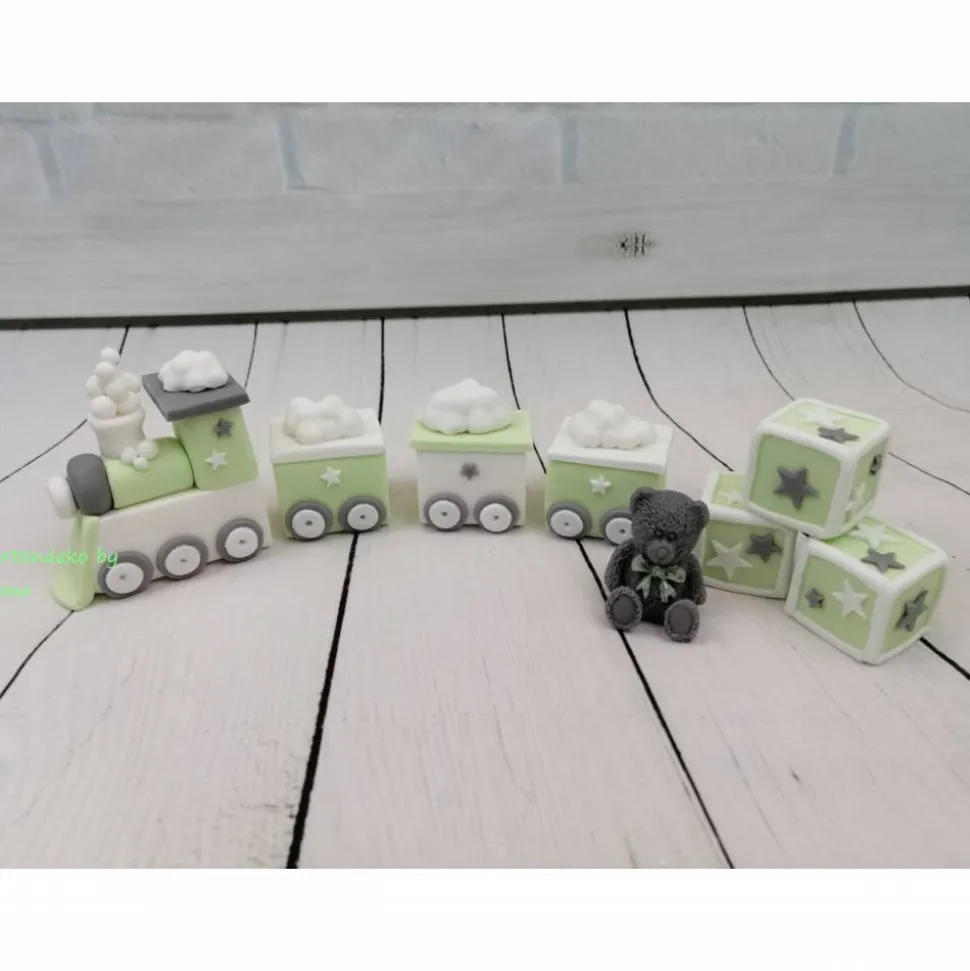 Hier bekommt ihr eine wunderbare Deko für die Tauftorte oder zur Geburt . Das komplette Set ist ein Zug mit 3 Waggons mit Wolken und 1 Teddy und 3 Würfel . Ihr könnt aus verschiedenen Varianten wählen. Die Farbe kommt nicht so gut rüber, es ist Pastell grün ( ungefähr wie mein Schriftzug auf den Bild ) und weiß und grau.