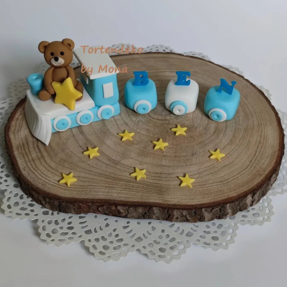 Tortenmotiv Heißluftballon mit Teddys und Zug mit Namen, Sterne und Wolken. Es sind verschiedene Varianten, die Sie gerne kaufen möchten möglich, einfach die Variante wählen. Der Ballon besteht aus einer Styropor Kugel mit einem Durchmesser von 10 cm . Höhe der Ballons von Korb( Styropor drunter) ab sind 25 cm.Teddys sind ca 7 cm hoch.