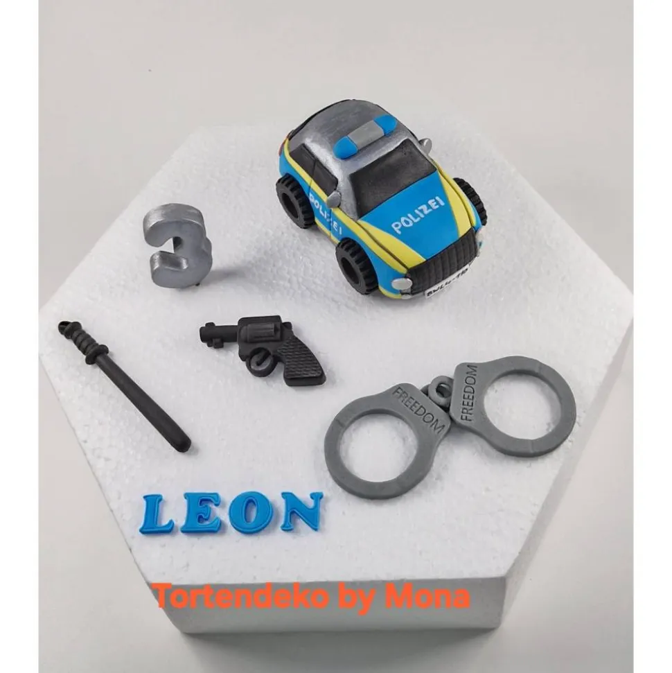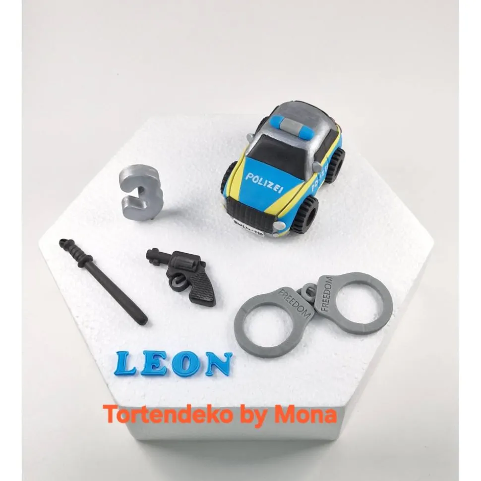 Verwandle jede Torte in ein Highlight mit diesem handgefertigten Tortenaufleger Fondant Polizeiauto mit Zubehör.