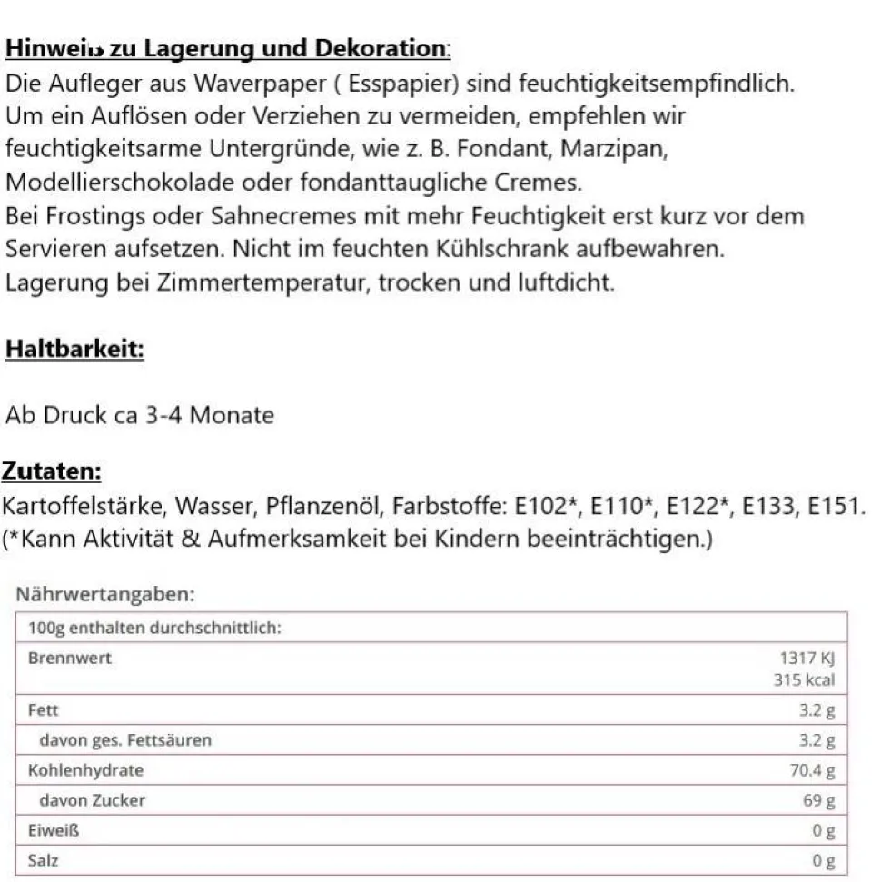 Zu Nährwert, Zutaten, Lagerung und Haltbarkeit lesen sie bitte die Bildbeschreibung.