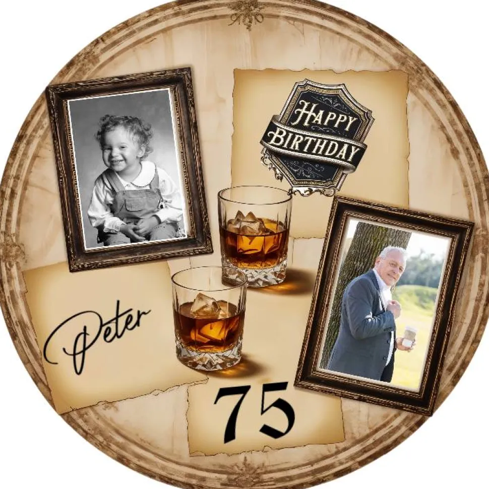 Feiern Sie den runden Geburtstag eines besonderen Mannes mit unserem edlen Tortenaufleger. Personalisiert mit Zahl, Namen und 2 Bildern, ist es der perfekte Hingucker für die Feier. Das Geburtstagskind wird staunen. Der Aufleger wird aus Esspapier hergestellt und auch bereits ausgeschnitten.