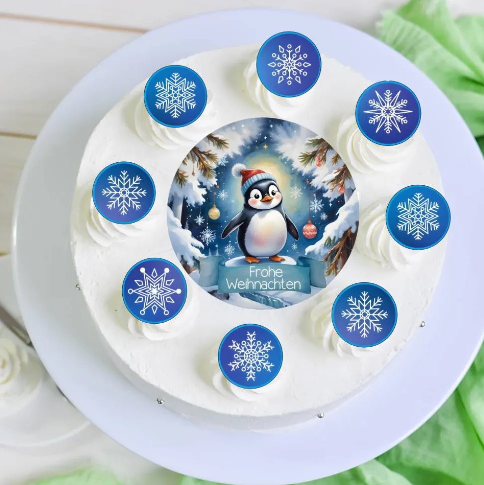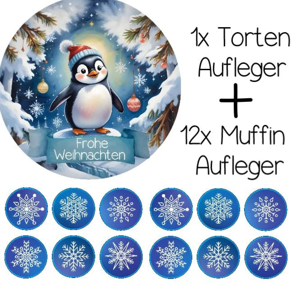 Feiern Sie ein freudiges und romantisches Weihnachten mit dem Tortenaufleger Set „Frohe Weihnachten mit Pinguin“. Der verspielte und niedliche Pinguin wird sicherlich jedes Fest noch fröhlicher machen. Das Set enthält Muffinaufleger und einen Tortenaufleger, um Ihre Gäste zu begeistern. Machen Sie Weihnachten zu einem Fest voller Spaß und Freude. Die Aufleger eignen sich für Muffins, Kekse oder Desserts.
