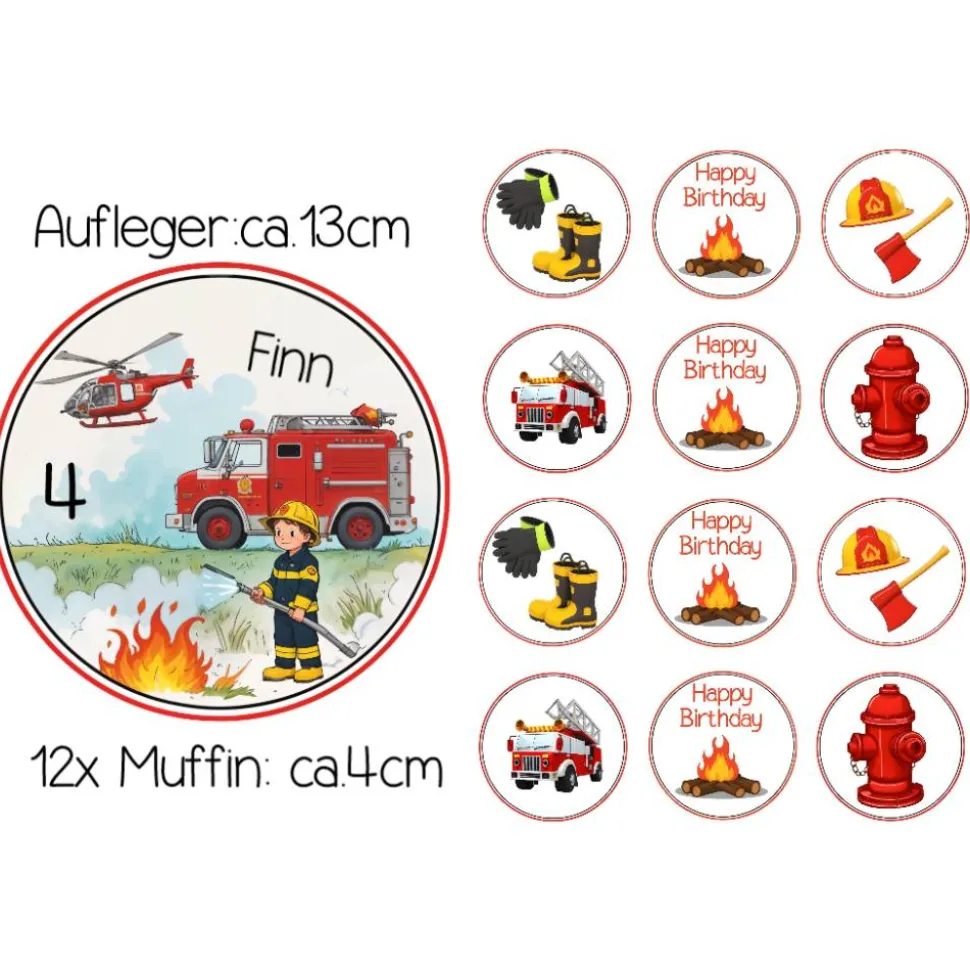 Verleihen Sie der Geburtstagstafel Ihres Kindes mit dem Tortenaufleger+Muffin Set Feuerwehr eine tolle Optik. Das Set besteht aus einem personalisierten Tortenaufleger und 12 Muffinauflegern aus Esspapier. Eine perfekte Kombination für eine leckere Geburtstagstorte sowie dekorative Muffins. Passend für viele Möglichkeiten.
