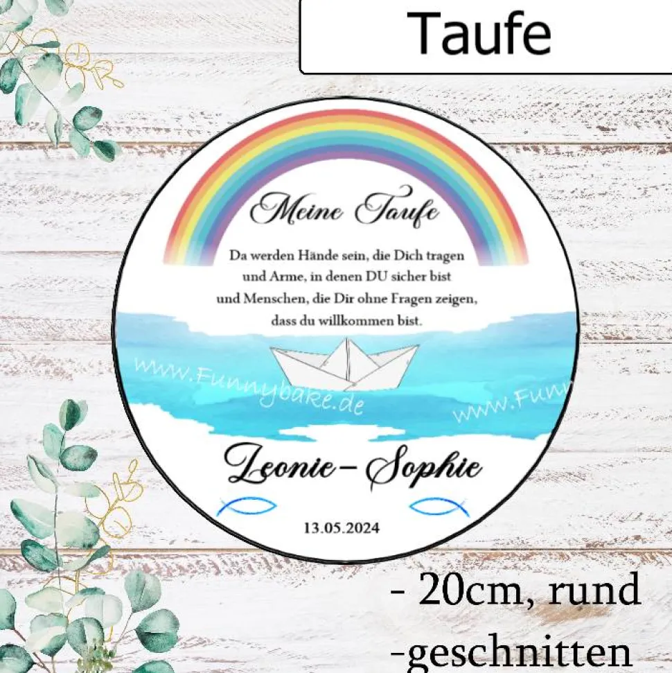 Mit einem Regenbogen im Aquarell-Stil geschmückt, wird der Aufleger Ihrer Tauftafel ein passendes Highlight verleihen.