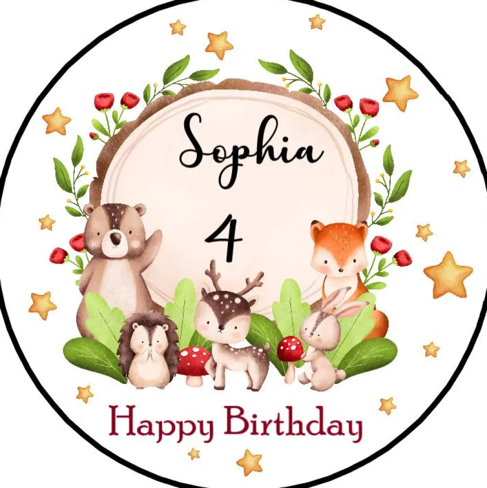 Mit süßen Waldtieren, Sternen, deinem Namen und der Geburtstagszahl