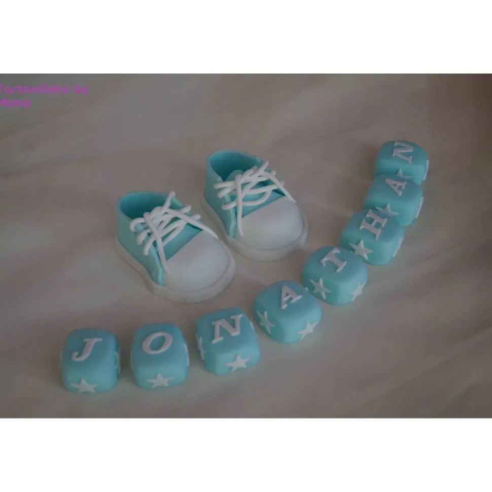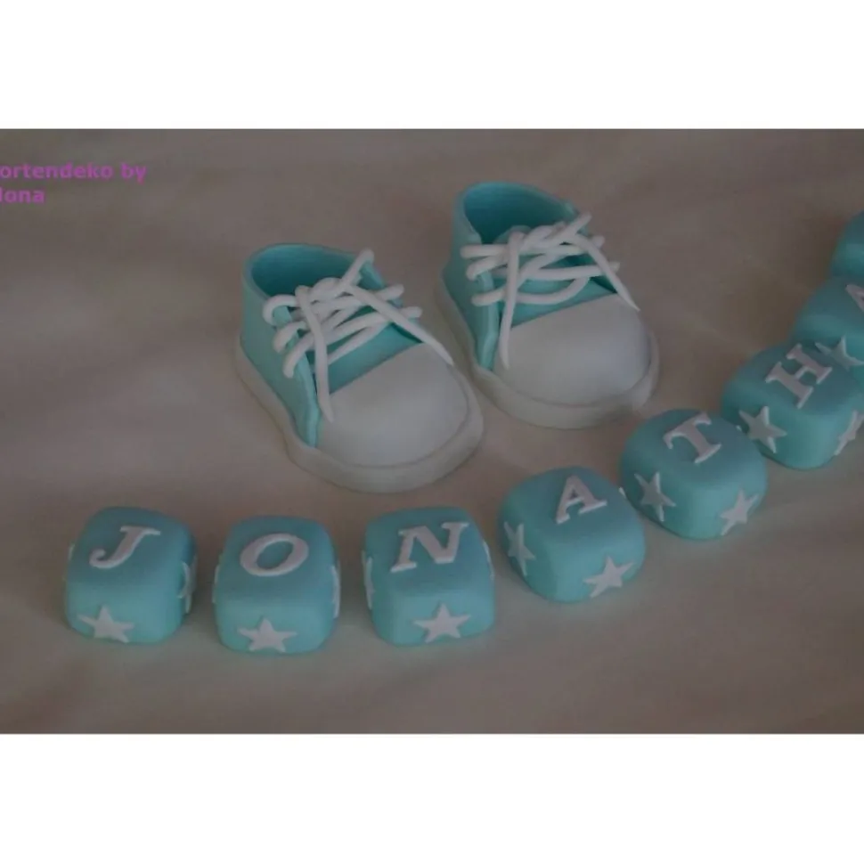 Eine Tortendeko für die Geburt, Geburtstag, Taufe ein Taufset mit Schuhe, Name in Würfelform, alles was im Angebot zu sehen ist gehört zum Angebot