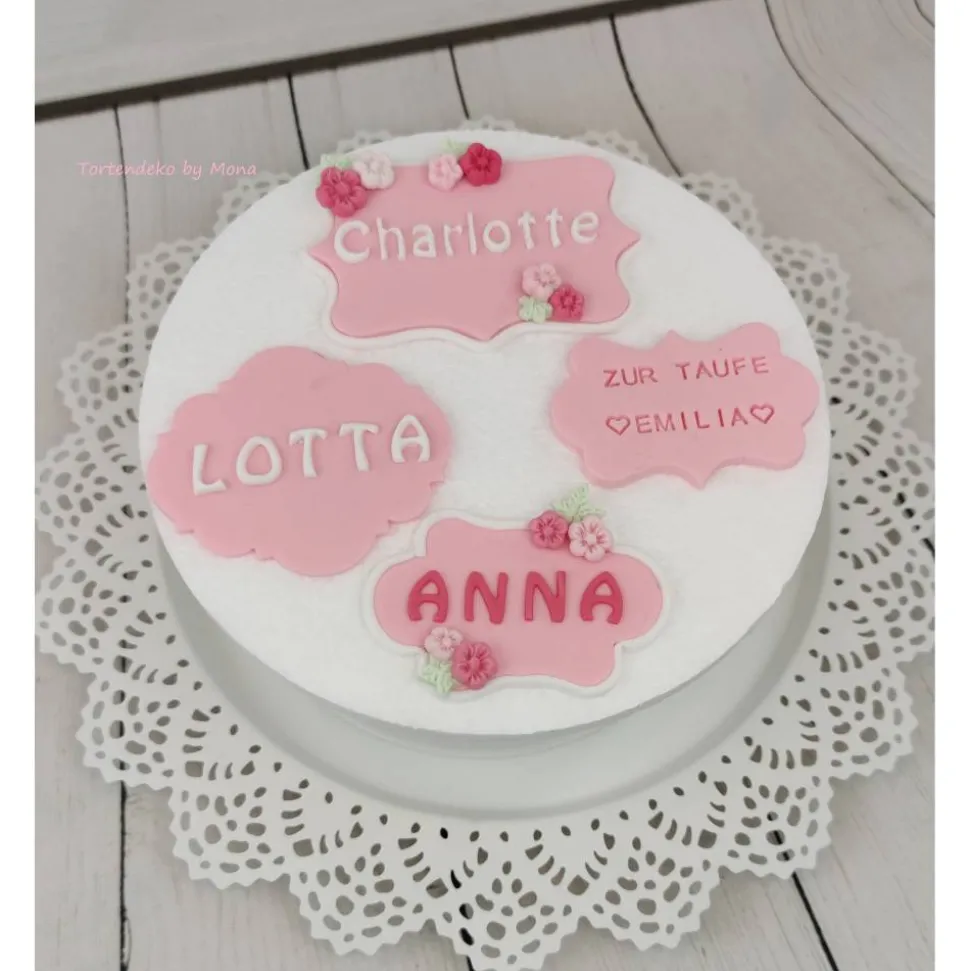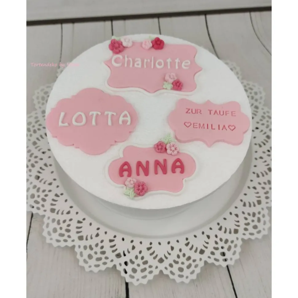Hier könnt ihr aus verschiedenen Tortenschilder für den Namen eure Kleinen Mäuse wählen. Diese Schilder können auch für Jungs gemacht werden und auch in anderen Farben. Es können auch anstatt Blumen kleine Schmetterlinge, Tauben, Entchen, Hase, Bärchen,Pferd, Sterne drauf gemacht werden.