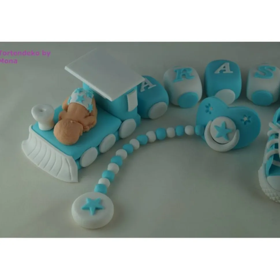 Eine Tortendeko für die Taufe, Geburt,Geburtstag,Zug mit Namen,Schuhe, Schnuller. Kann auch für ein Mädchen gemacht gemacht werden.