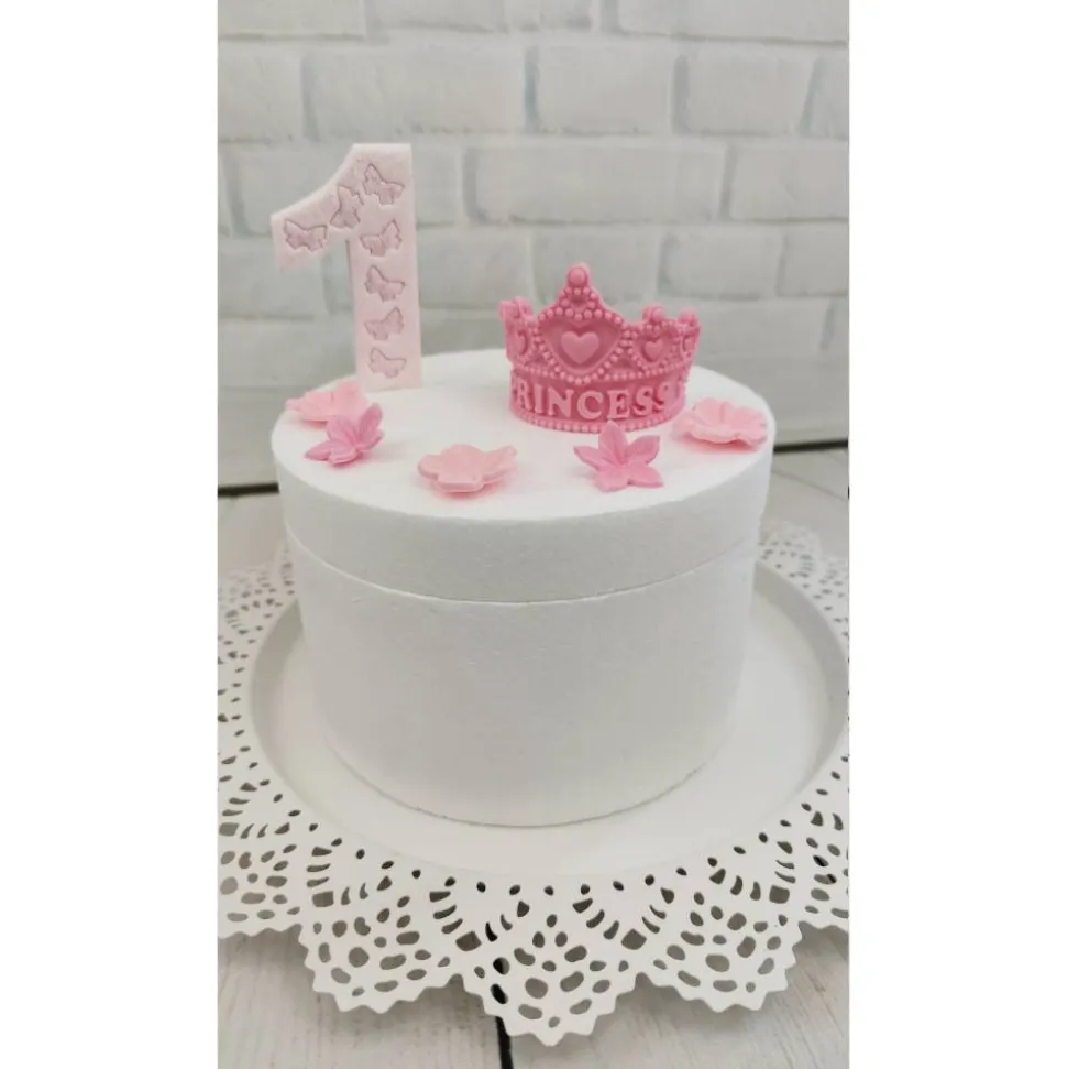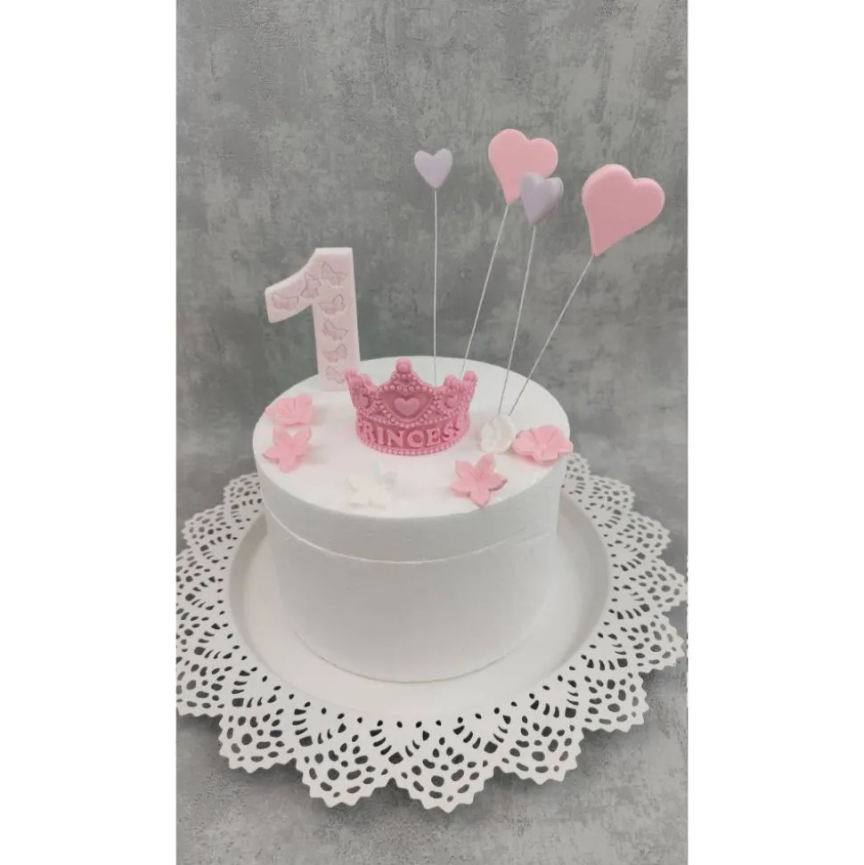 Hier bekommt ihr ein tolles Set für eine Prinzessin Torte zum 1. Geburtstag. Im Set enthalten sind eine Zahl nach Wunsch, eine Krone, 2 große und 2 kleine Herzen und 6 Blumen. Der Name kann auf Wunsch dazu erworben werden.