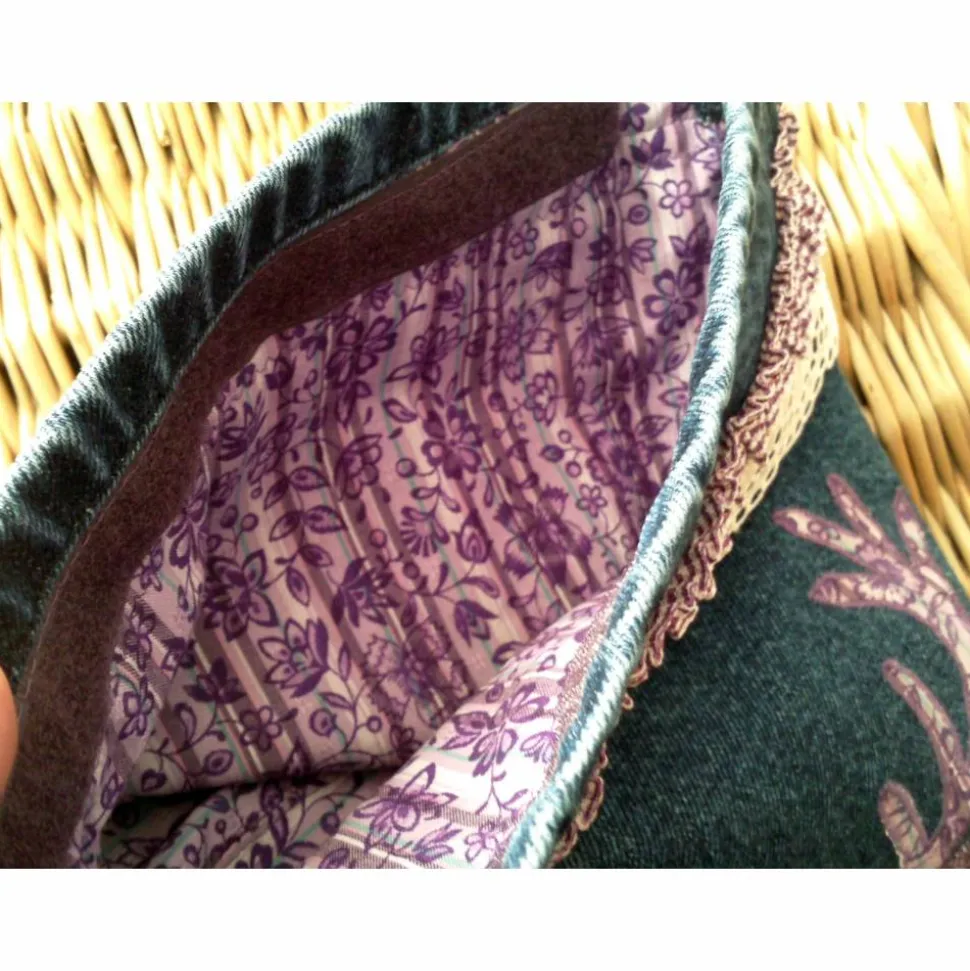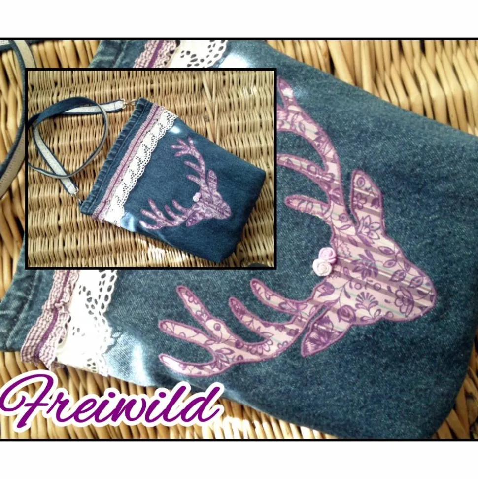 Tascheninnenfutter in lila wie die Applikation, Sicher mit einem Klettverschluß zu verschließen, mit einer Hirschapplikation, 2 Satinröschen, einer Stickerei-Spitze und einer Karo-Rüschenborte verziert. Ein langer Henkel mit Stickereispitze verstürzt.