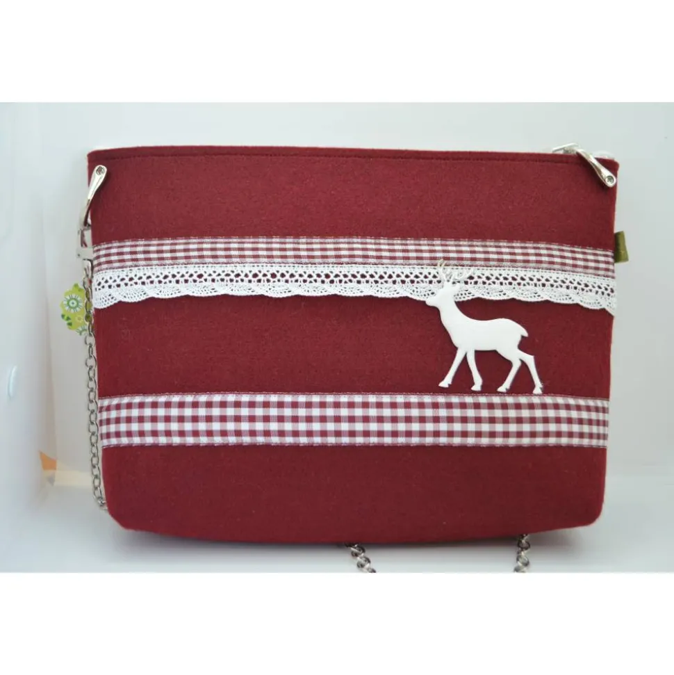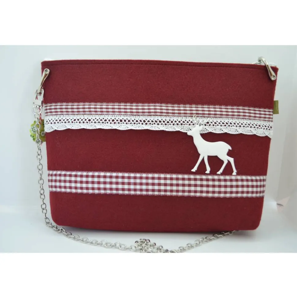 Eine Tasche aus weinrotem Filz, mit rot-weiß-kariertem Band, Spitze und Filzhirsch. An dieser Tasche ist eine Kette aus Metall als Henkel.