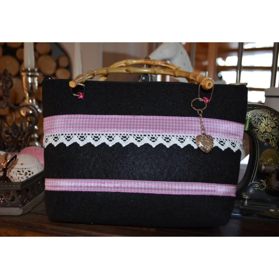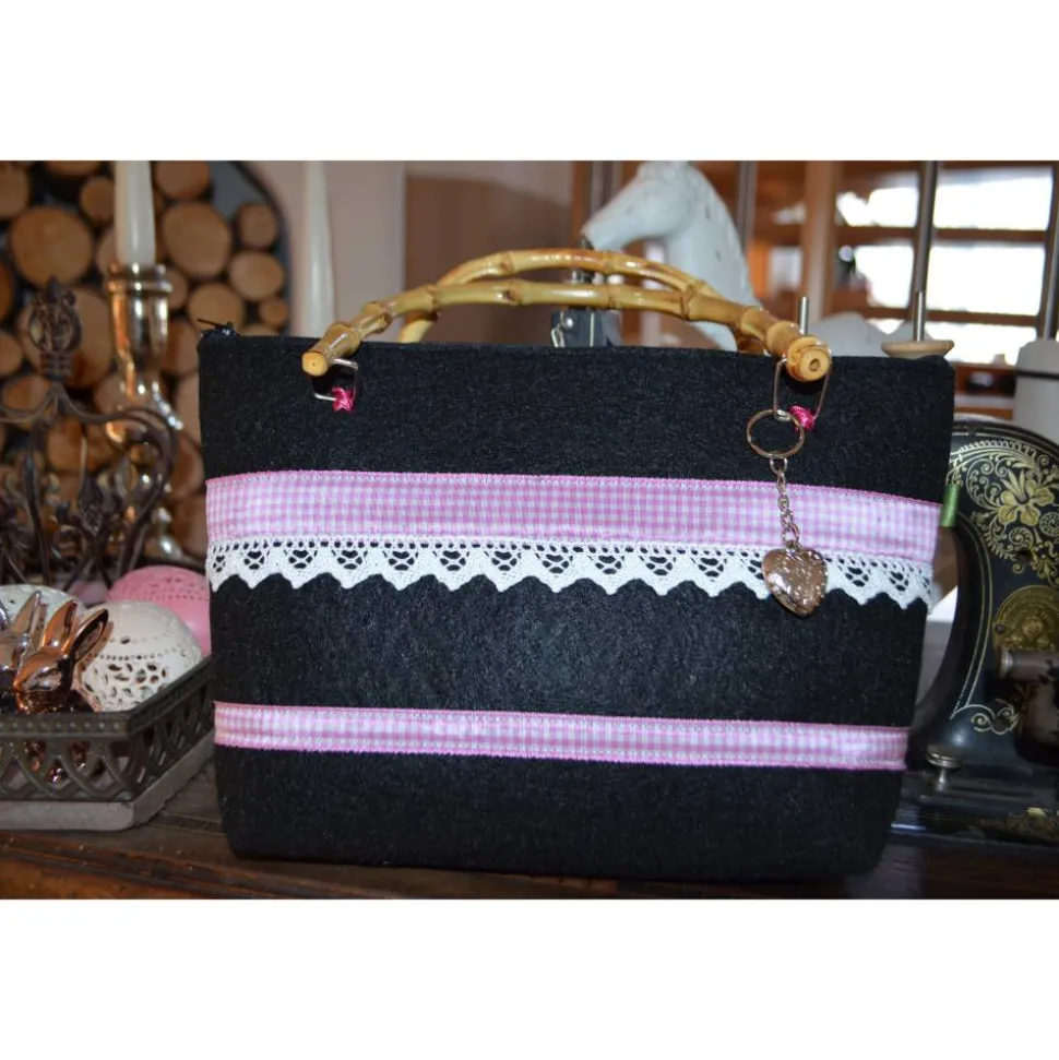 Diese Tasche aus anthrazit farbenem Filz mit rosa-weiß-kariertem Webband und Spitze. .