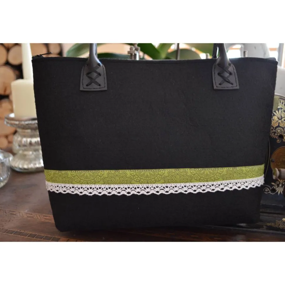 Diese schlichte Tasche aus schwarzem Filz mit olive-farbenem Webband und weißer Spitze sieht super zum Dirndl aus. Natürlich kann man diese Tasche auch zur Jeans tragen.