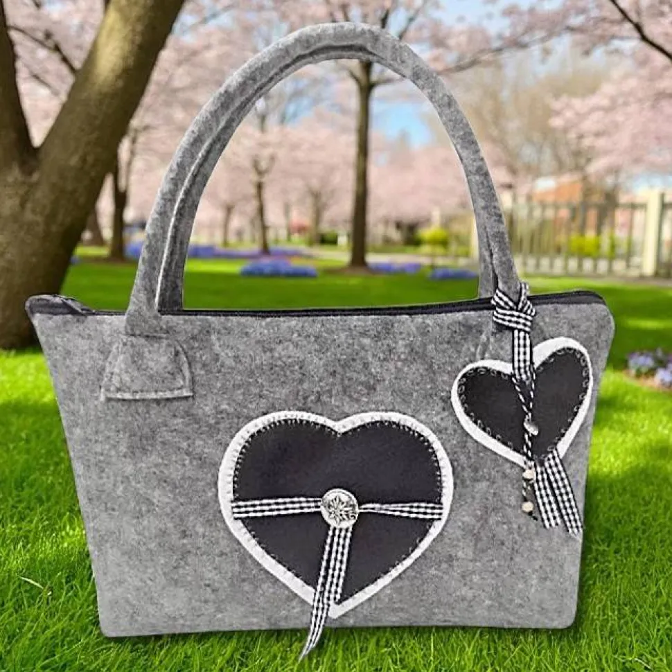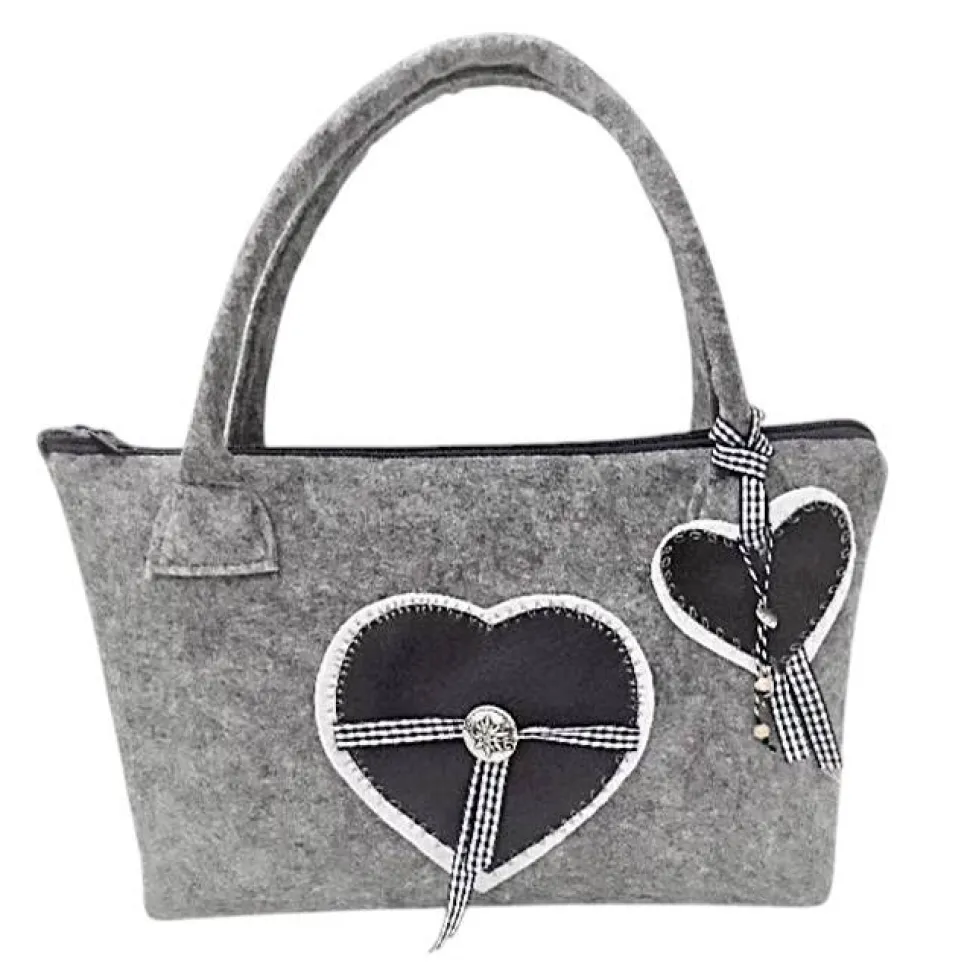 Trendige Dirndltasche mit Reißverschluss, Innentasche und Henkel aus Filz. Mit vielen schönen Stickereien, einem abnehmbaren Taschenbaumler in Herzform und an der Taschenfront eine verziertes Herz aus Kunstleder.