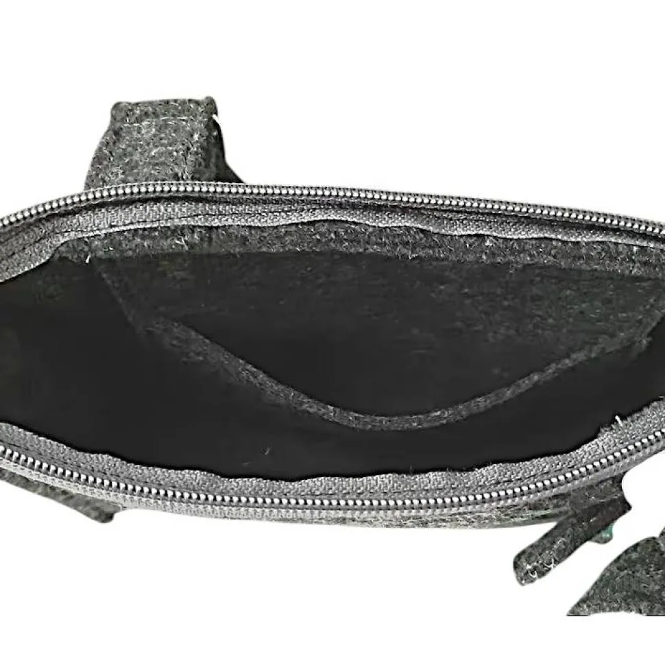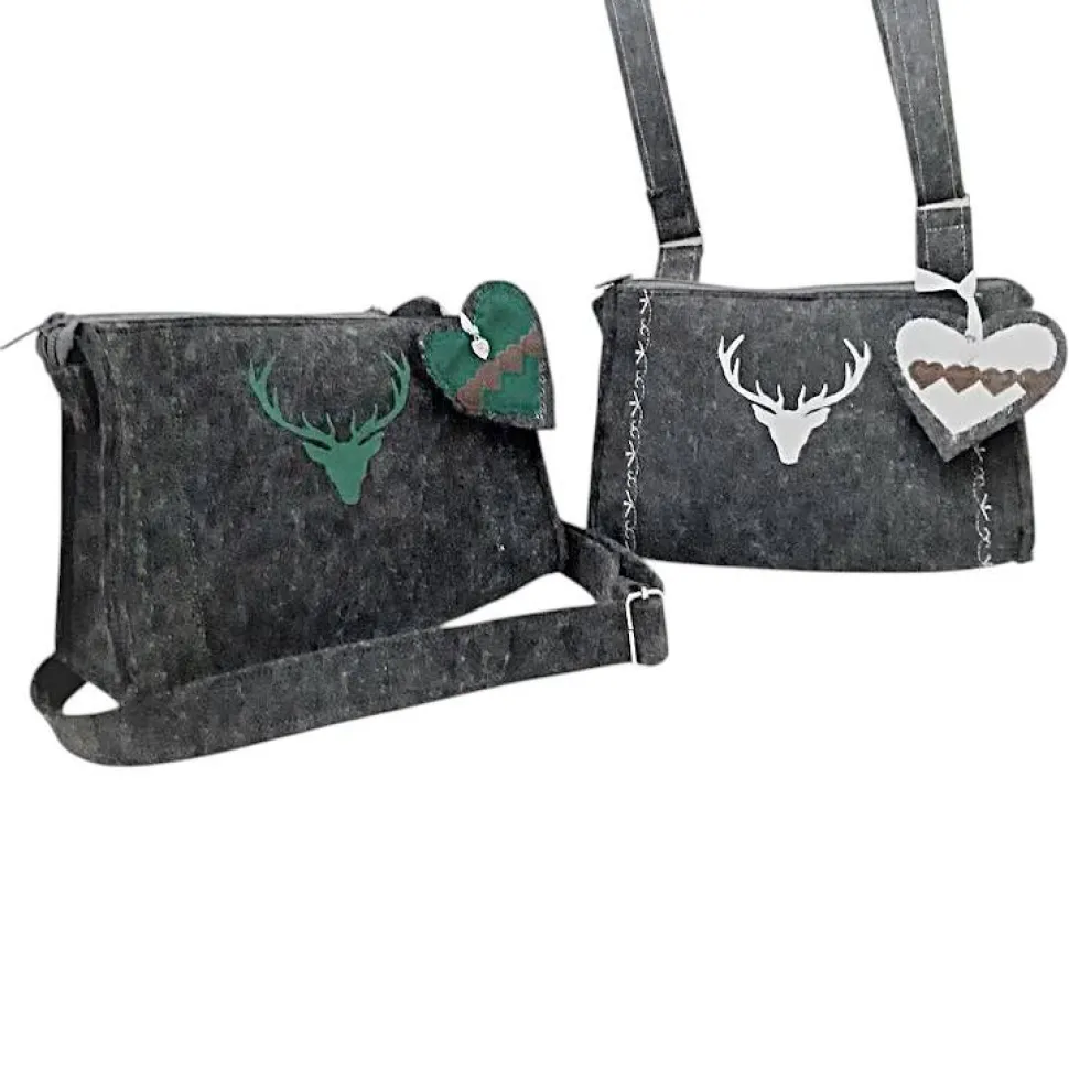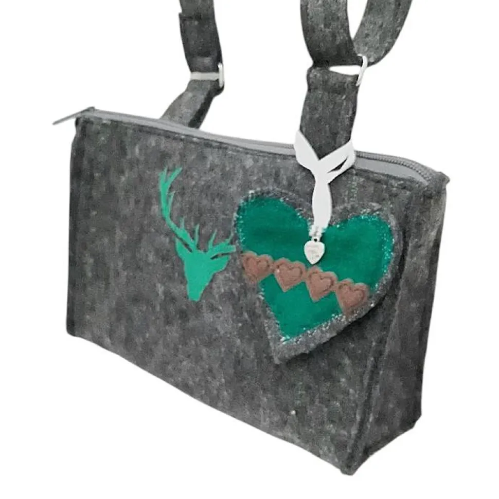 Trendige Dirndltasche mit Reißverschluss, Innentasche und verstellbarem Schultergurt aus Filz. Mit vielen schönen Stickereien, einem abnehmbaren Taschenbaumler in Herzform und an der Taschenfront einem Hirschkopf aus Flockfolie angebracht.