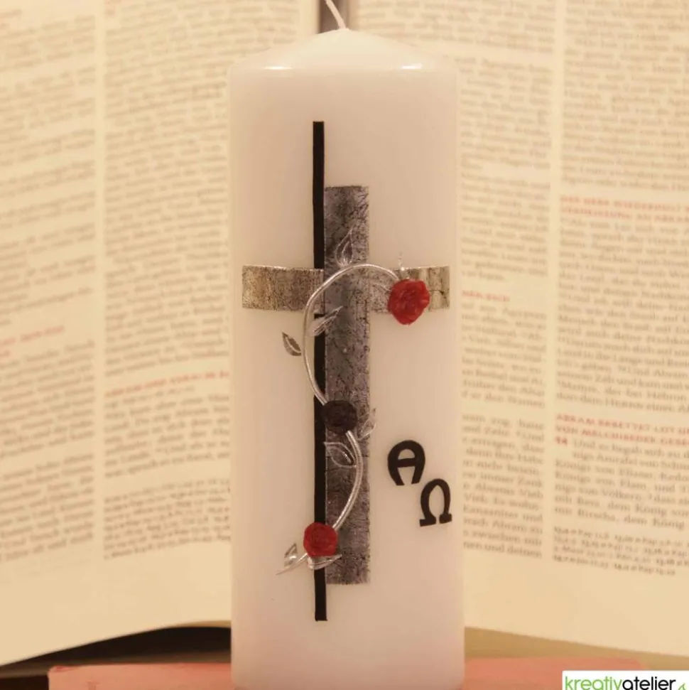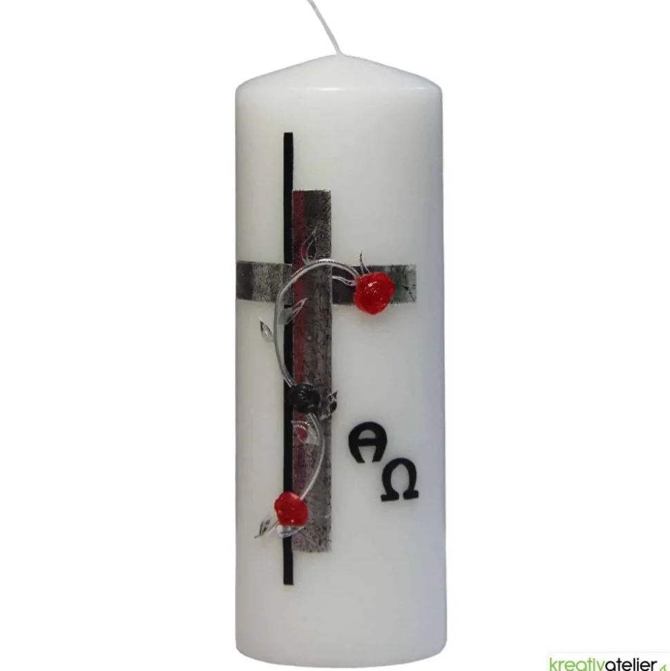 In schweren Zeiten brauchen wir Trost und Halt. Eine Trauerkerze kann dabei helfen, das Gedenken an den Verstorbenen zu bewahren und ihm einen Platz im Herzen zu geben. Die Trauerkerze Alpha Omega mit Kreuz in antik silber ist eine besonders individuelle und stilvolle Art, dem Verstorbenen zu gedenken.