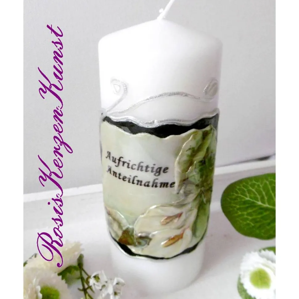 Wir haben einen Kerzenstumpen mit einem Wachsbild und dem Schriftzug “ In stillem Gedenken “ in Vollwachsauflage gestaltet. Die Individualisierung ( Beschriftung ) wird ohne Extrakosten von uns nach Ihren Angaben aufgebracht.