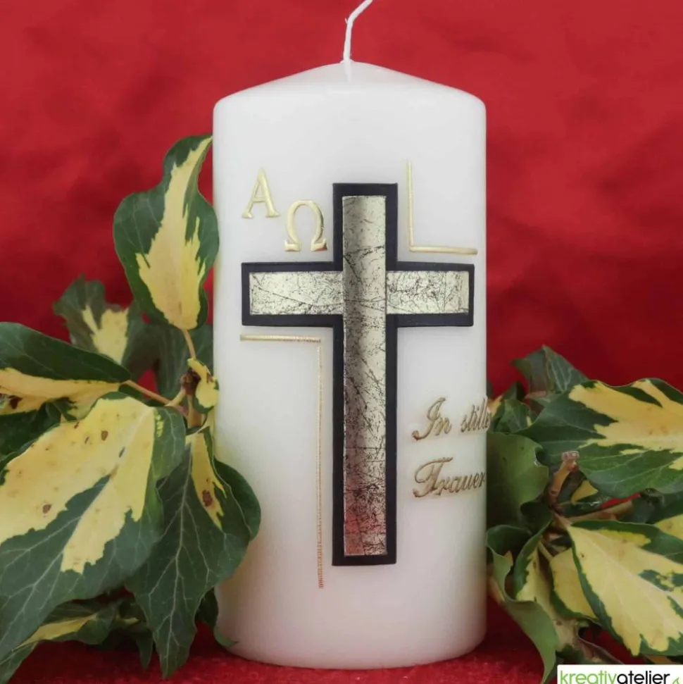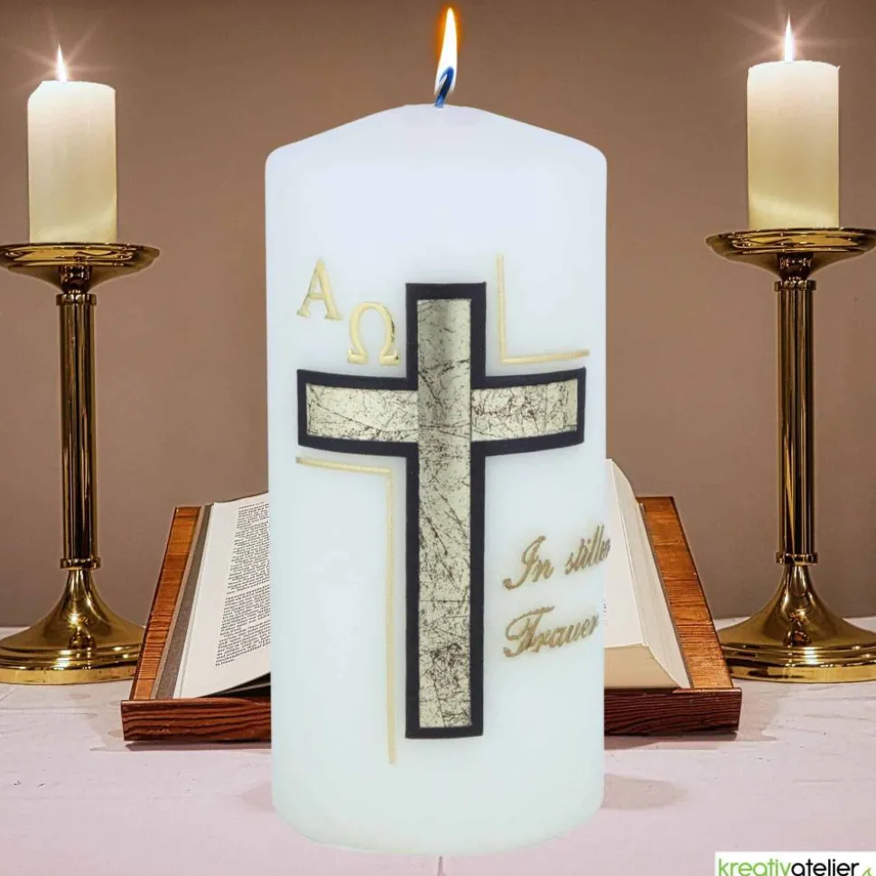 Das Alpha und Omega, ein Symbol für den Anfang und das Ende, ist kunstvoll auf der Gedenkkerze platziert. Die goldenen Streifen und der warme Goldton des Schriftzugs „In stiller Trauer“ verleihen der Kerze eine sanfte und beruhigende Ausstrahlung.