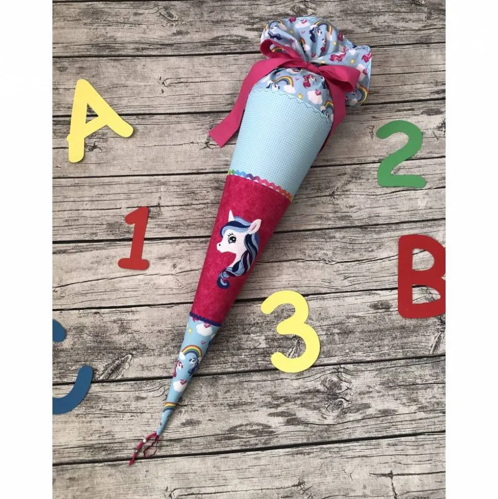 Hier habe ich eine ganz besondere in Pink und Blau für euch. Genäht aus schönen Baumwollstoffen, und bestickt mit einem wunderschönen Einhorn-Motiv von Marilena, und vielen kleinen Details.