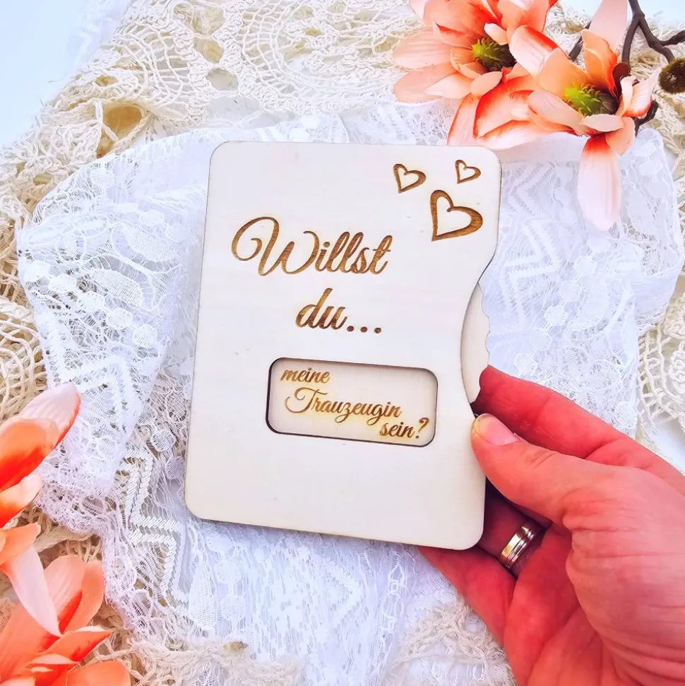 Mache den besonderen Moment unvergesslich mit unseren einzigartigen und personalisierten Holzdreh-Karten, um deine Freunde / Geschwister / Eltern zu fragen, ob sie deine Trauzeugen oder Trauzeuginnen werden möchten. Jede Drehscheibe ist liebevoll gestaltet und bietet auf der Rückseite Platz für eine persönliche Nachricht. Unsere hochwertigen Karten eignen sich ideal als Geschenk und werden deine Liebsten sicher zum Lächeln bringen.