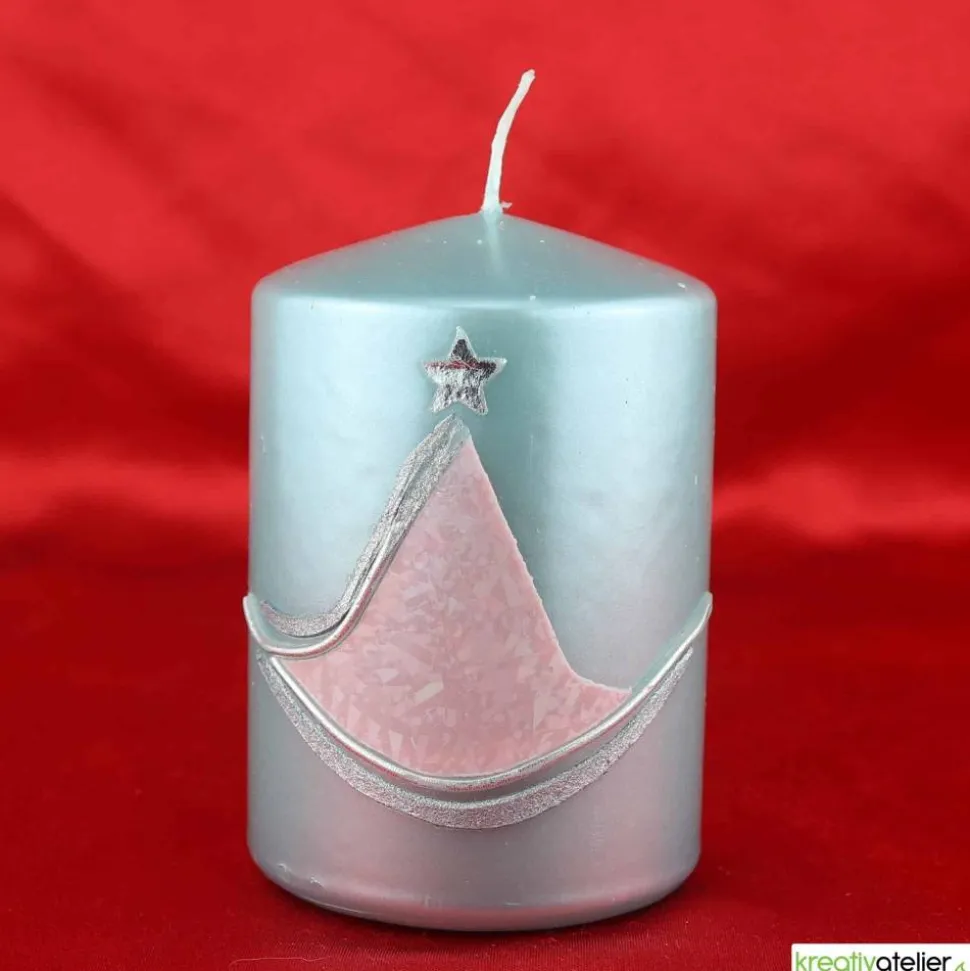 Meine Weihnachtskerzen werden aufwändig von Hand mit Wachs verziert. Zunächst wurde die Oberfläche dieser Kerze mit einer Kerzenfolie in türkis überzogen. Dadurch bekommt sie den Metalleffekt. Der modern anmutende Tannenbaum besteht aus rosafarbigem Wachs mit Diamanteffekt. Dieser Effekt verleiht dem Tannenbaum etwas Edles. Dieses Edles wird von den silbernen Rundstreifen besonders betont. Die mattsilbernen Akzente runden das Gesamtbild dieser Weihnachtskerze wunderbar ab. Alle Ornamente werden einzeln von Hand aus verschiedenen Wachsplatten ausgeschnitten und kunstvoll auf der Kerze zu einem Gesamtbild arrangiert.