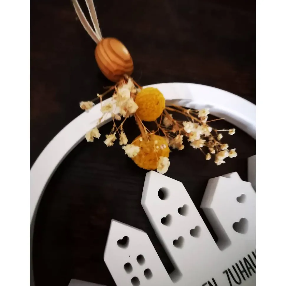 Dieser handgefertigte Fensterkranz wird aus hochwertigem Keramikgießpulver gegossen, sorgfältig von Hand geschliffen und liebevoll mit Trockenblumen sowie einer Holzperle verziert. Mit einem Durchmesser von ca. 18 cm ist dieser Häuserkranz ein echter Blickfang an deiner Tür, im Fenster oder an der Wand.