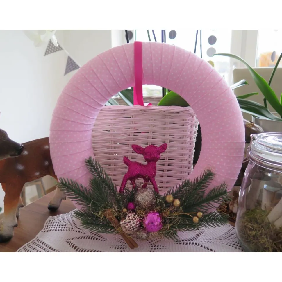 … mit pinkfarbenem Rehkitz, Kugeln, Tannenzweigen, Zimtstange usw. verziert