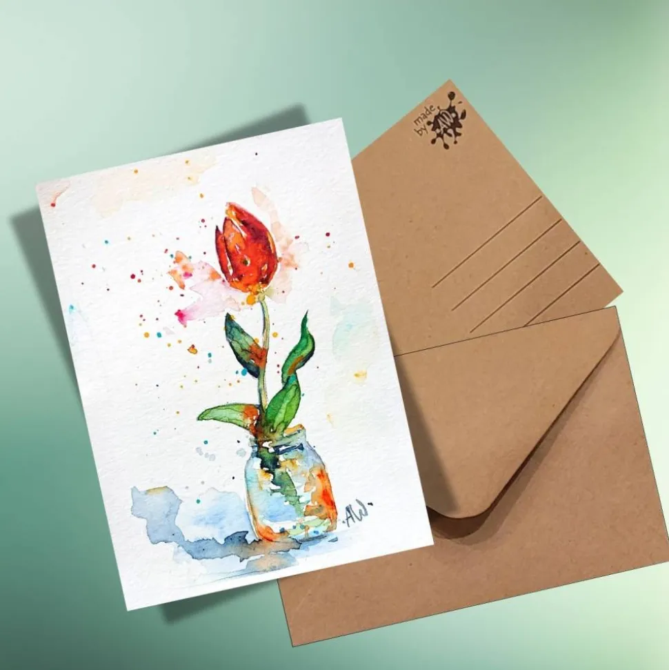 Entdecke die farbenfrohe Postkarte „Tulpe im Glas“ – dein perfekter Frühlings- und Ostergruß!