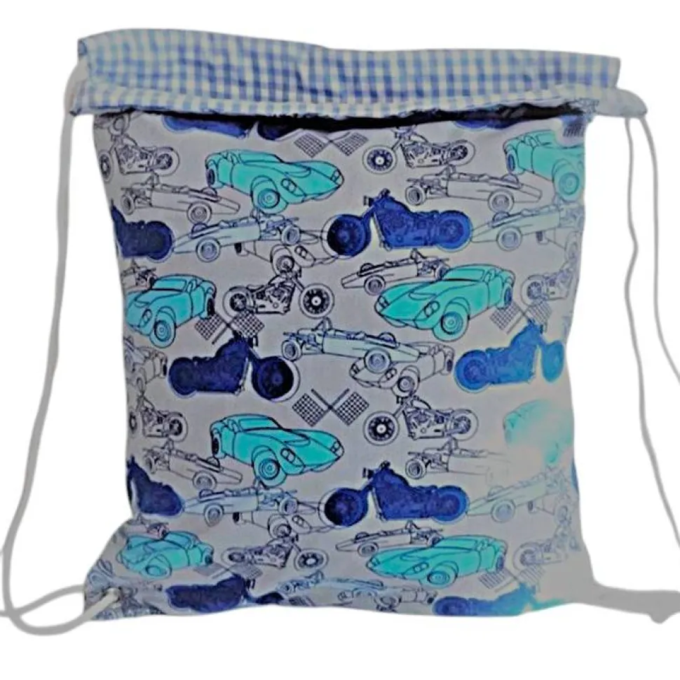Turnbeutel, Rucksack blau mit Auto-Motiv, personalisierbar