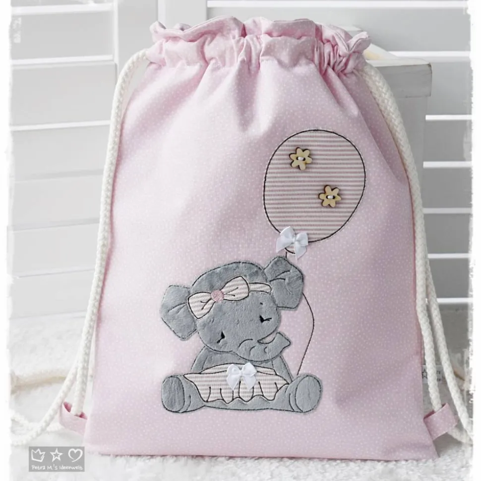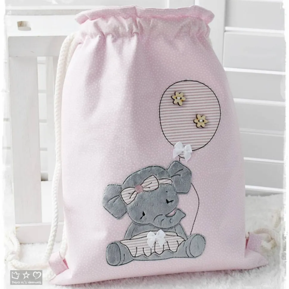 *Liebevoll genähter Rucksack-/Beutel in verschiedenen Größen aus hochwertigen Stoffen, unterlegt mit Volumenvlies für mehr Stabilität. Auf der Vorderseite befindet sich eine Doodlestickerei ‚Elefant mit Luftballon‘ und auf Wunsch kann ein Name aufgestickt werden. Die Innenseite des Rucksacks-/Beutels ist mit einem farblich passenden Baumwollstoff gefüttert. Ebenso befindet sich eine kleine Tasche (z.B. für Taschentuch usw) im Inneren.