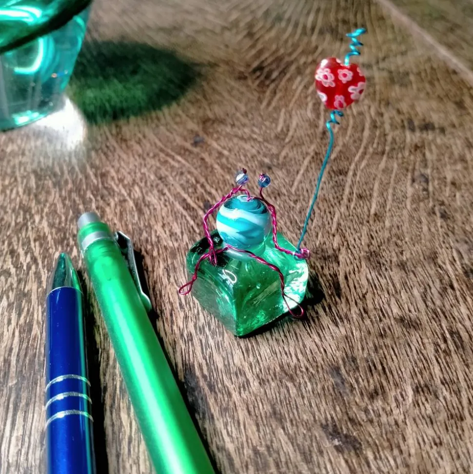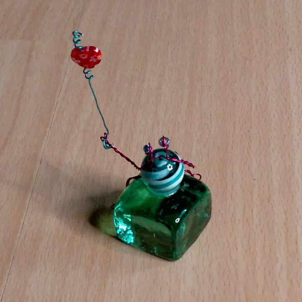 Eine wunderschöne Perle aus Glas ist sein Körper und die Arme und Beine sind aus Draht. Das kleine Herz ist ein Millefiori aus Glas.