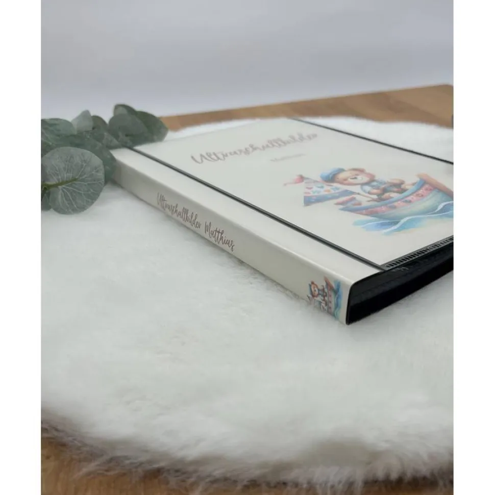 Du kannst wählen, ob du die Folien leer oder mit hochwertig bedruckten Vorlagen erhalten möchtest. Unter jedem Ultraschallbild findest du zwei Zeilen, auf denen du das Datum und die Schwangerschaftswoche festhalten kannst. Das sanfte Design mit dem niedlichen Teddybären auf seinem Schiffchen fängt die Magie dieser besonderen Zeit ein und macht das Album zu einem einzigartigen Erinnerungsstück. Durch die Personalisierungsmöglichkeit wird es zu deinem ganz persönlichen Unikat – du kannst das Deckblatt mit dem Namen deines Kindes und/oder einem Spruch deiner Wahl gestalten lassen.