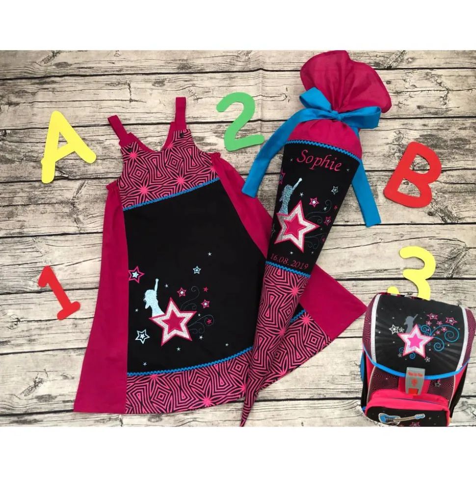Hier habe ich ein ganz besonderes Angebot für euch, ich erstelle euch eine Schultüte und das passende Kleid nach dem Schnitt Vida von Farbenmix ganz nach euren Wunschvorgaben. Ihr dürft, Wunschfarben und Thema an mich weiter geben und ich zaubere euch ein ganz persönliches Unikat. Gerne stimme ich die beiden Sachen auch farblich auf euren Ranzen ab!