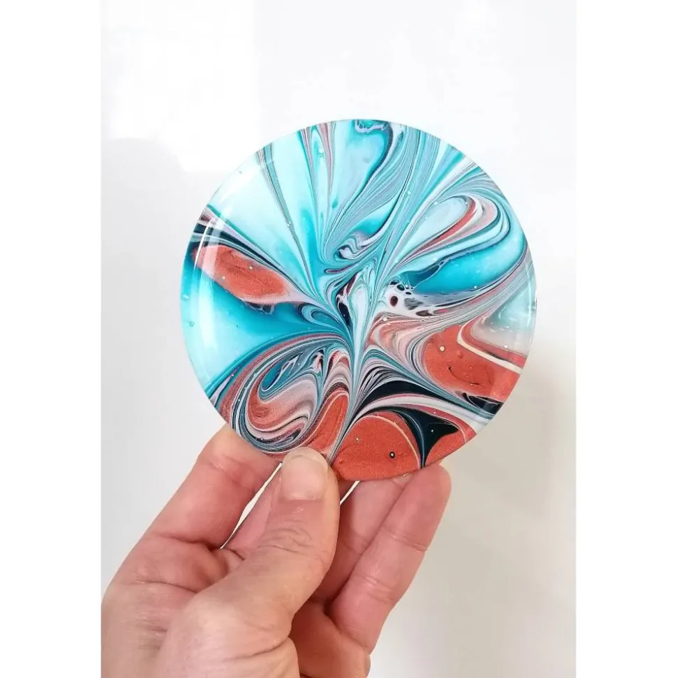 Entdecke einzigartige Fluid Art Untersetzer – handgemalt auf flachen Acrylplatten und veredelt mit hochwertiger Resinbeschichtung. Die fließenden Farben in Blau und Bronze machen diesen Untersetzer zu einem echten Blickfang für Dein Zuhause.