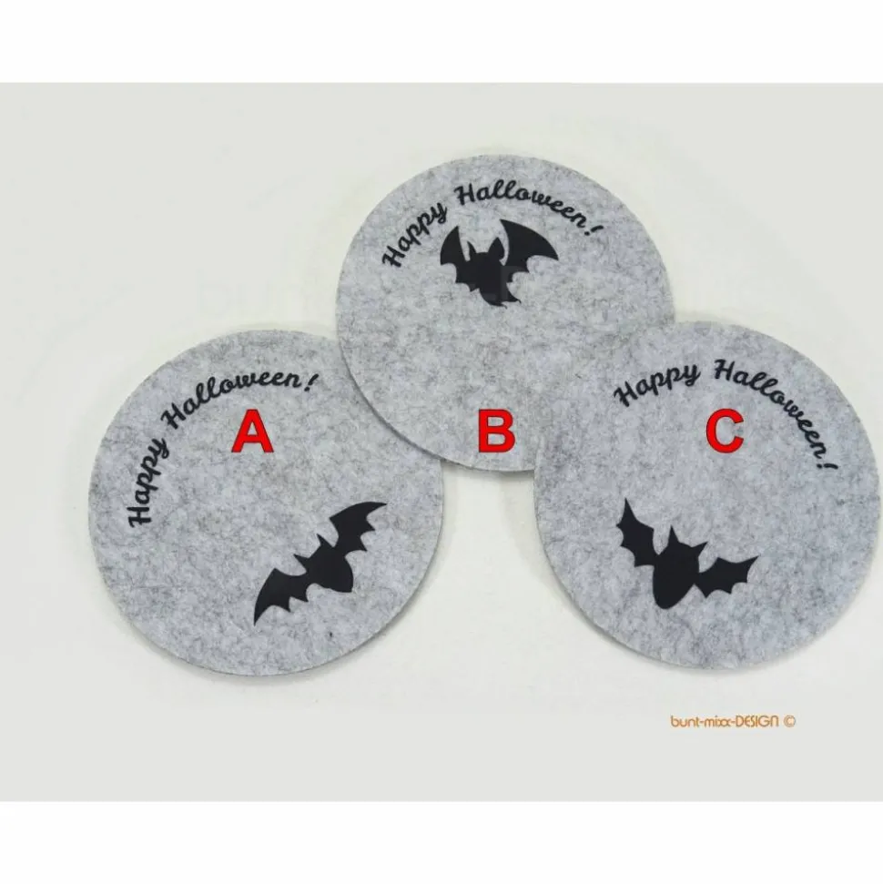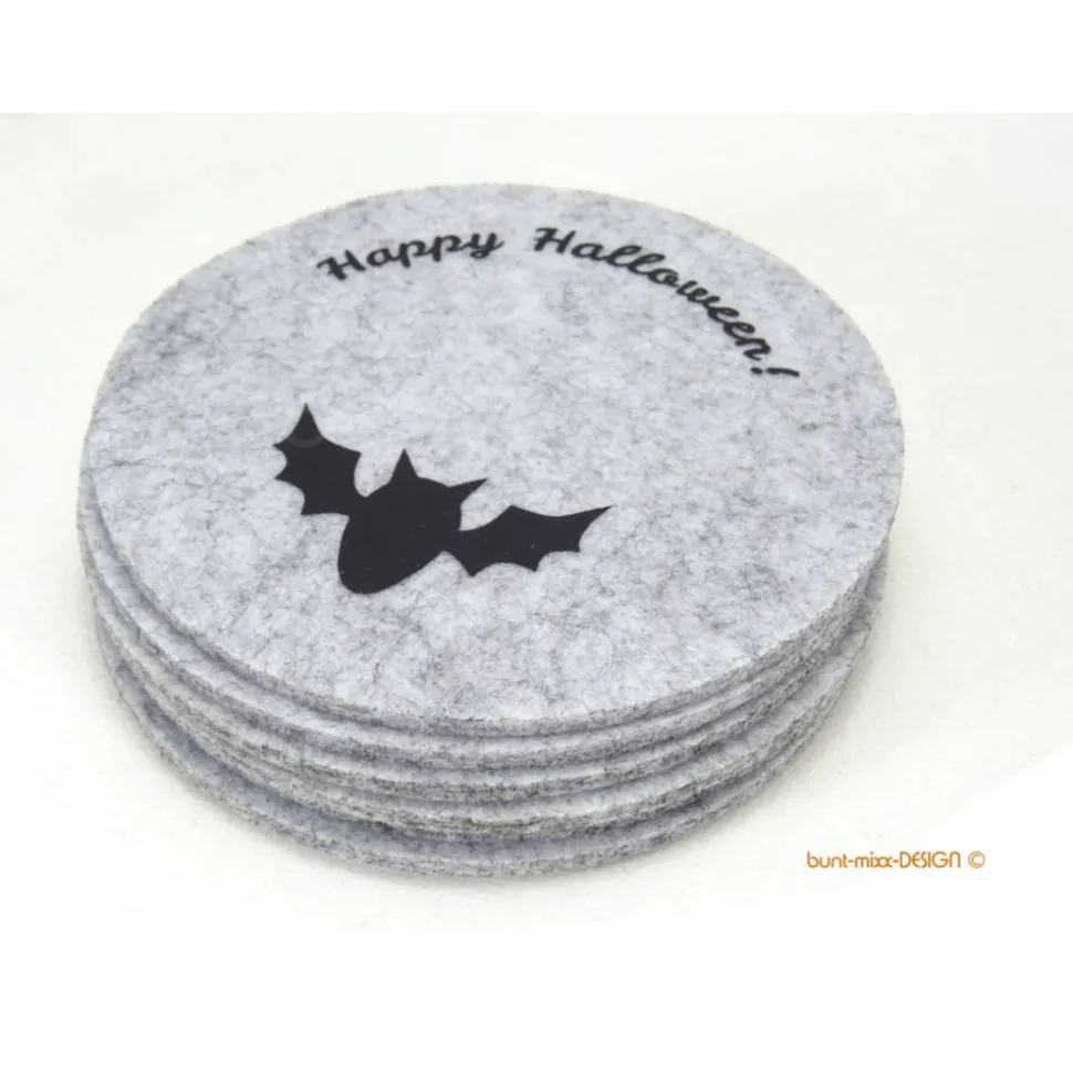 Die Untersetzer sind aus Filz hellgrau, nach eigenem Entwurf bedruckt mit Schrift „Happy Halloween“ und Fledermaus, schwarz